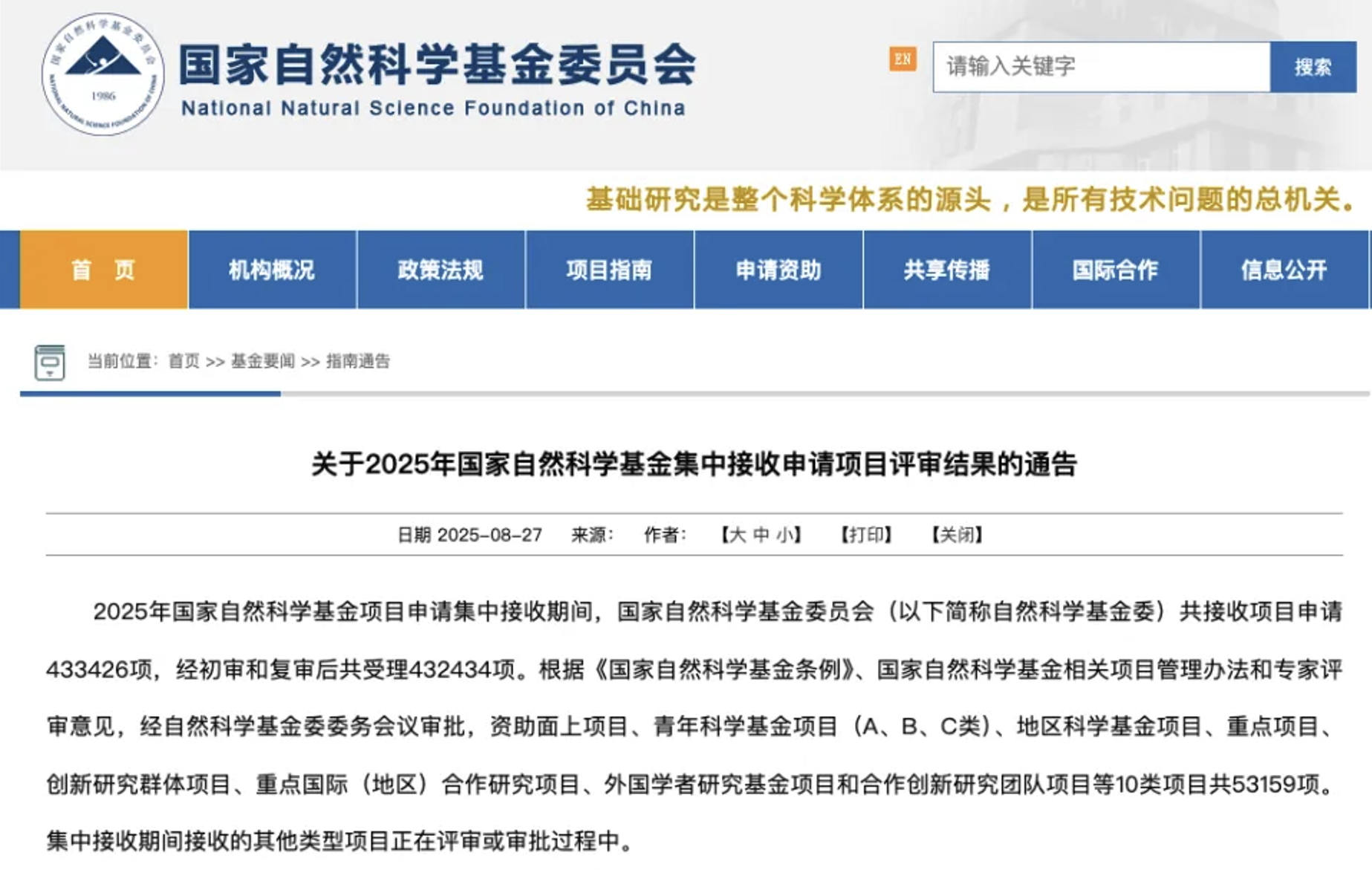 8月27日,国家自然科学基金委员会发布《关于2025年国家自然科学基金集中接收申请项目评审结果的通告》,公布了本年度集中接收申请项目评审结果。