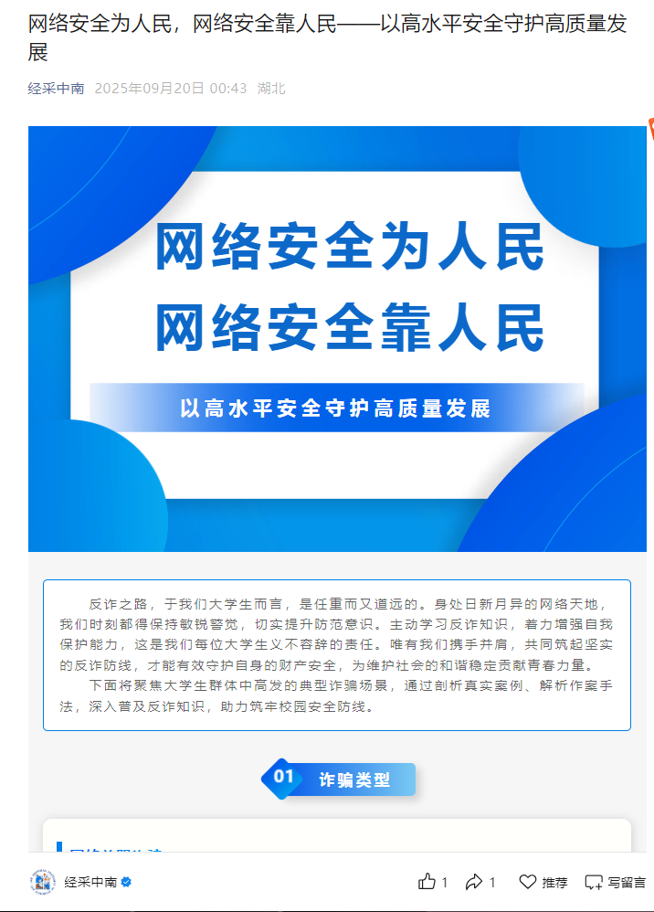 活动期间,学院依托官方微信公众号 “经采中南” 发布网络安全宣传推文,聚焦“校园贷”、虚假购物诈骗等学生身边的安全风险,用真实案例拆解诈骗套路,让学生直观了解网络陷阱。同时,组织学生以“集中+自主”模式观看“反诈第一课”:班级利用课间、班会开展集中观看与讨论,学生结合自身经历交流感悟;未到场学生通过线上平台完成观看并提交心得。此外,学院还组织学生参与全国大学生网络安全知识竞答,试题涵盖法规、技术、风险防范等内容,以赛促学检验学习成果。​