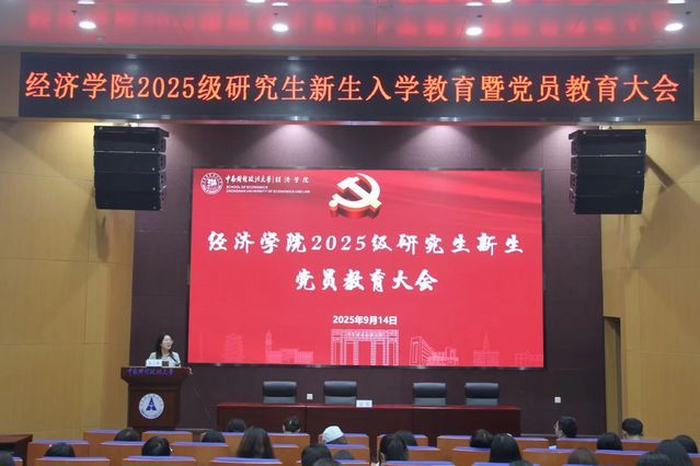 为助力经济学院2025级研究生新生顺利开启学术新程,同时强化新生党员党性修养,经济学院于9月14日14:30在文翰楼北报告厅举办研究生新生入学教育暨党员教育大会,2025级硕士研究生辅导员岳明泽、2025级博士研究生辅导员雷菁、经济学院全体2025级研究生新生参与本次大会。