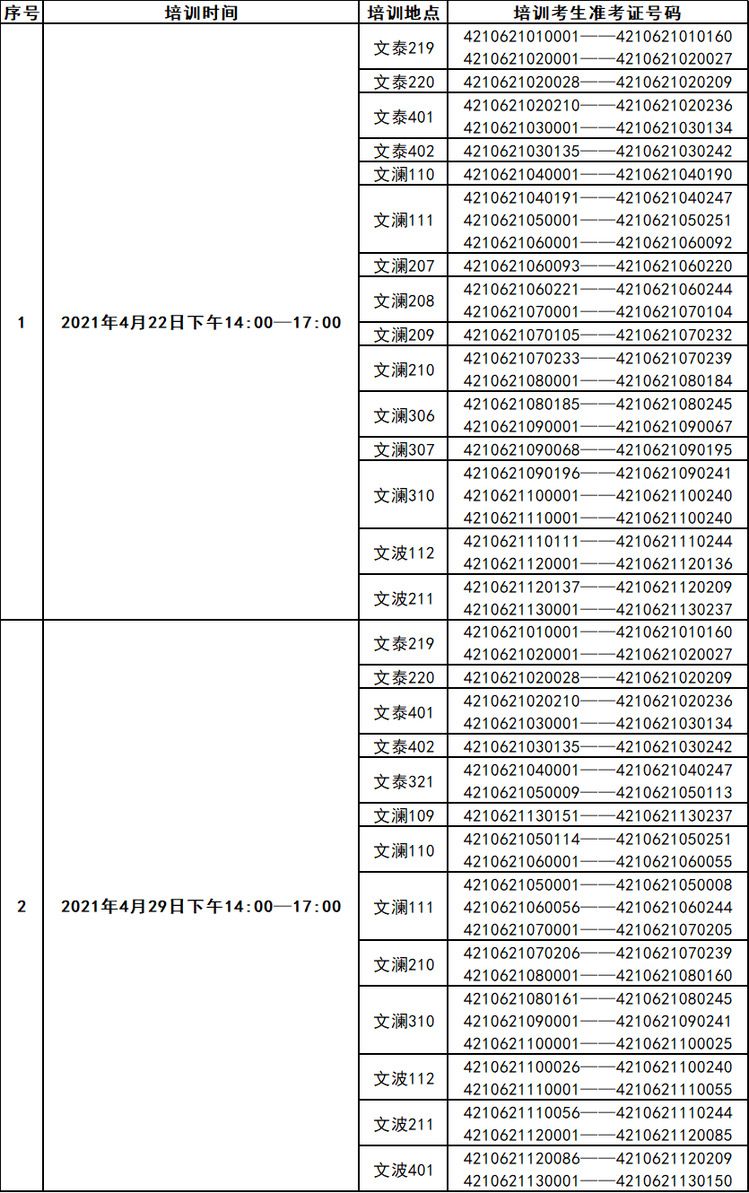各位师生: 2021年第一次计算机辅助普通话水平测试考前培训定于4月22日、4月29日进行,考前培训时间及地点安排如下,请已报名并缴费的师生按准考证号码到指定教室参加考前培训。预祝各位考生取得好成绩! 校语言文字工作委员会办公室 校普通话测试站 2021年4月14日
