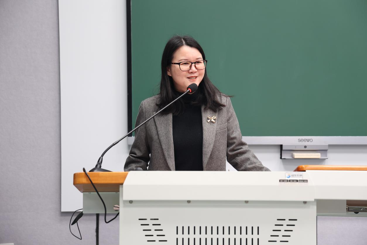 开幕式第二项,工商管理学院王淑红教授作为评委专家代表发言。她结合自己的经历,分享了对于竞赛的看法。王淑红认为讲课竞赛是青年教师提升个人能力的宝贵机会,教师能在竞赛过程中能够很好地深化自己的教学认知、打磨自己的课程设计、锻炼自己的课堂组织能力和授课技巧,进而实现以赛促教、以赛促改。最后,王淑红代表评委专家承诺将在大赛过程中认真履职,严谨评判。