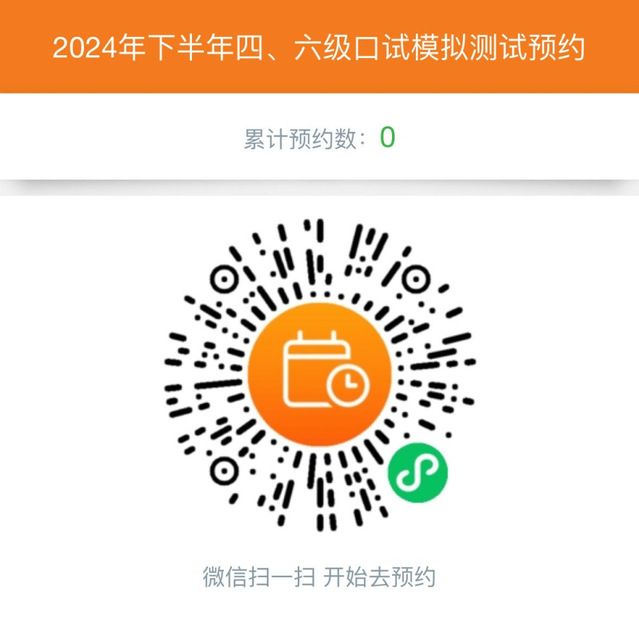 学校于11月21日下午在文波楼为参加本次口语考试同学安排模拟测试,请有意者扫描下方二维码进行预约。预约成功后,于当日携带口试准考证按时参加。