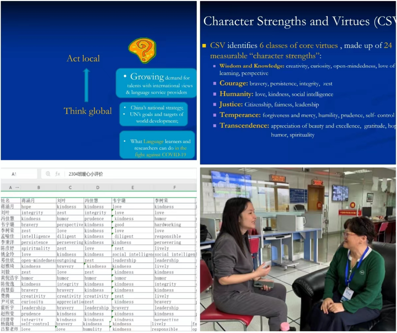 三、以课本为基础,充分拓展,实现以语为媒,价值引领。这一节随堂课,既体现了吕黎老师对英语专业学生在基础阶段学习方法、英语技能练习的重视,也体现了她对语言类学生视野的重视。作为课后常规作业和每节课热身内容,吕黎老师要求学生选择本周所学的单词,结合充分的调查研究,围绕身边事、国家事、天下事写作3-5句的段落,于每节课前轮流分享。分享后学生复述、师生点评。这样的做法不仅使学生实现了词汇的日积月累,锻炼了段落写作和口语表达技巧,更培养了学生与党和国家同心同向,与时代同频的主人翁意识,将课程思政落实于潜移默化之中。在督导听课后的说课和评课环节,吕黎老师表示,我国领导人在国际峰会上的讲话、中国传统节日、我国最新科技进展、国际时事热点都是学生分享的高频话题。吕黎老师还介绍了更多她对学生价值引领的做法。比如在开学第一课,便对学生进行立足本土、放眼全球的专业认知教育,介绍新冠肺炎疫情期间语言志愿者及国家应急语言服务团的应急语言服务,使学生了解语言和语言工作者在社会生活中发挥的重要作用,树立学生的专业认同及家国情怀;解读“一带一路”政策及联合国《2030可持续发展议程》中可持续发展目标,使学生了解当前国内及国际对有国际视野的复合型人才和语言服务行业从业者日益增长的需求;分享“语言服务人才技能构成图”,为学生树立学习目标;邀请保研、同专业考研、跨专业考研、跨专业就业等各种发展方向的已毕业师兄师姐用书信、语音等形式对新生寄语。更多的对学生的引领则是结合课本进行。比如,学习以“正直”为主题的论说文,则向学生介绍积极心理学中的性格优势(美德)测试,引导学生找到自身性格优势,挖掘反映该性格优势的自身成长故事和古今中外名人故事,写作以自身性格优势为题的论说文,同时,邀请同学们写出自己眼中全班每位同学最突出的一个性格优势并告诉他/她,以期每位同学都能收到其他同学的赞美。吕黎老师面向英语专业新生的“基础英语(1)”教学,既把学生语言技能训练落到实处,又带领同学们向外探索世界,向内认识自我,创造彼此欣赏鼓励的班级氛围,体现了外国语学院专业基础课教师的专业使命感和人文情怀。