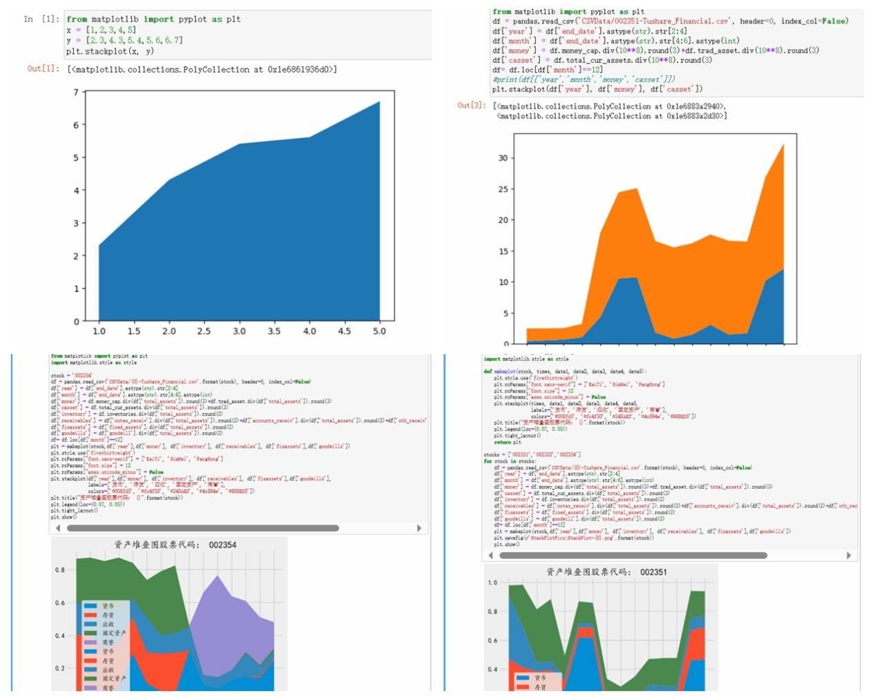 一是边展示边指导学生操作,有利于提高学生动手能力。“基于Python的会计大数据分析”是一门理论性、实践性和综合性均很强的实验课程,主要讲授信息化、智能化和大数据背景下的财务和会计数据分析的基本方法和基本技能,并通过大量的会计和财务数据分析案例,总结和提炼大数据分析的方法,并以Python为工具将其落地。因此,在教学方法设计上,特别强调“以学生为本”的教学理念和“问题导向”教学方法,教学方法包括以教师讲授和实验操作为主的课堂讲授法,以学生课后作业为主的案例分析法。在课堂上,老师先提出本节课需要解决的问题,然后讲解解决问题的方法和思路,接着会带领同学一起编写代码一步步解决问题,并现场指导同学们操作直到解决问题。比如,在讲授分析上市公司资产流动性时,老师提出需要按照资产的流动性构建资产堆叠图这个问题,然后带领同学分步骤实现。第一步,吕老师首先从最简单的堆叠图入手。第二步,引导同学下载企业数据,代替第一步的简单数据输入,形成少数几个资产的堆叠图。第三步,要求同学们参照前述的编程代码,自主完成一个相对标准的上市资产的堆叠图,并现场指导同学们编写代码,帮助同学修改代码。第四步,给同学们讲述函数化编程的好处以及如何进行函数化思维,现场和同学们一起将前三步完成的程序代码,进行函数化改造,从而训练同学们的程序化思维。