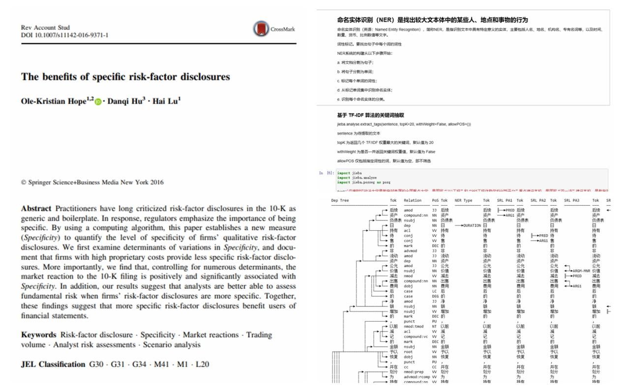二是结合国际最新研究成果,拓展学生视野。在讲授数据分析技术的同时,吕敏康老师还注重将国际最新研究成果融入到课堂中,拓展学生的视野。在本次课堂中,吕敏康老师还引导同学们初步实现一个“上市公司信息披露公告”的网络爬虫编写,并将会计国际顶级期刊《Review of Accounting Studies》2016年发表的论文《The benefits of specific risk-factor disclosures》中所提出的“文本特质性”引入到课堂,并就如何用其对上市公司财务数据进行再确认进行分析,并引导同学一步步实现,拓展同学们的视野。老师首先分析了这种方法的原理和益处,然后带领同学分步骤实现,最终实现NER的树状分析图谱。最后,带领同学们针对企业年报披露中的文本信息进行了分析,构建了验证性指标。