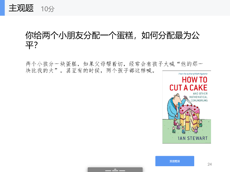 在学生各抒己见之后,任课教师给了最切合分配制度的方法:由一个孩子来切蛋糕,由另一个孩子来分配。这并不意味着分配的结果一定是最公平的,但让每个孩子都有了参与和共同决定的机会,在制度层面消弭了二者的争论。诸如此类的启发式问题几乎遍布在每一个知识点,将晦涩的理论具象化呈现,提升了学生的课堂参与度,也保障了学生长久的注意力集中。