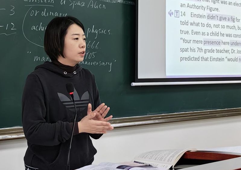 在张琦老师的英语课堂上,学生的热情和参与度很高。每当张琦老师提出问题,几乎总有一半以上的学生争相举手,渴望表达自己的观点,这点让督导组印象十分深刻。特别值得一提的是,这些积极举手的学生中,不乏英语基础并不突出的同学,但是他们仍然乐意举手,不怕犯错,勇敢表达。本次督导听课的课堂为“大学英语(1)”的阅读材料内容——爱因斯坦是外星人吗?在导入环节,张琦老师通过设计问题引导学生互动,让学生讨论为什么阅读材料要把爱因斯坦说成是“外星人”,通过讨论得出的结果是爱因斯坦在这个时代中脱颖而出是有多方面的综合因素的。张琦老师善于发问和设问,针对文中的材料,结合学生的生活,提出相应的问题,与学生进行实时互动,营造了良好的课堂教学氛围。