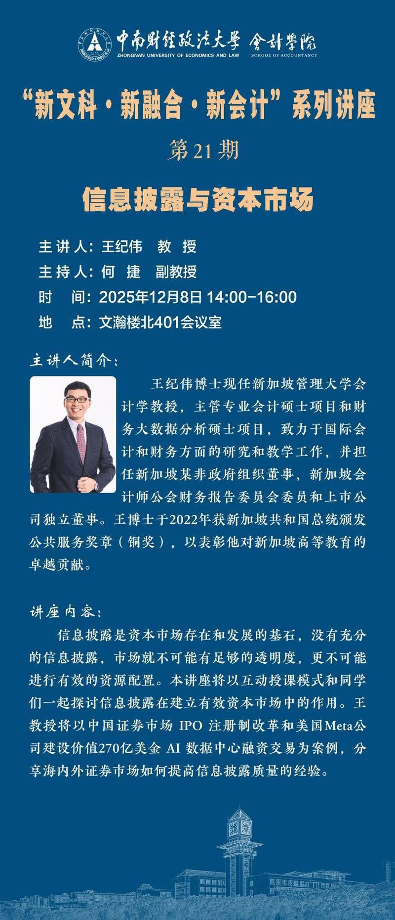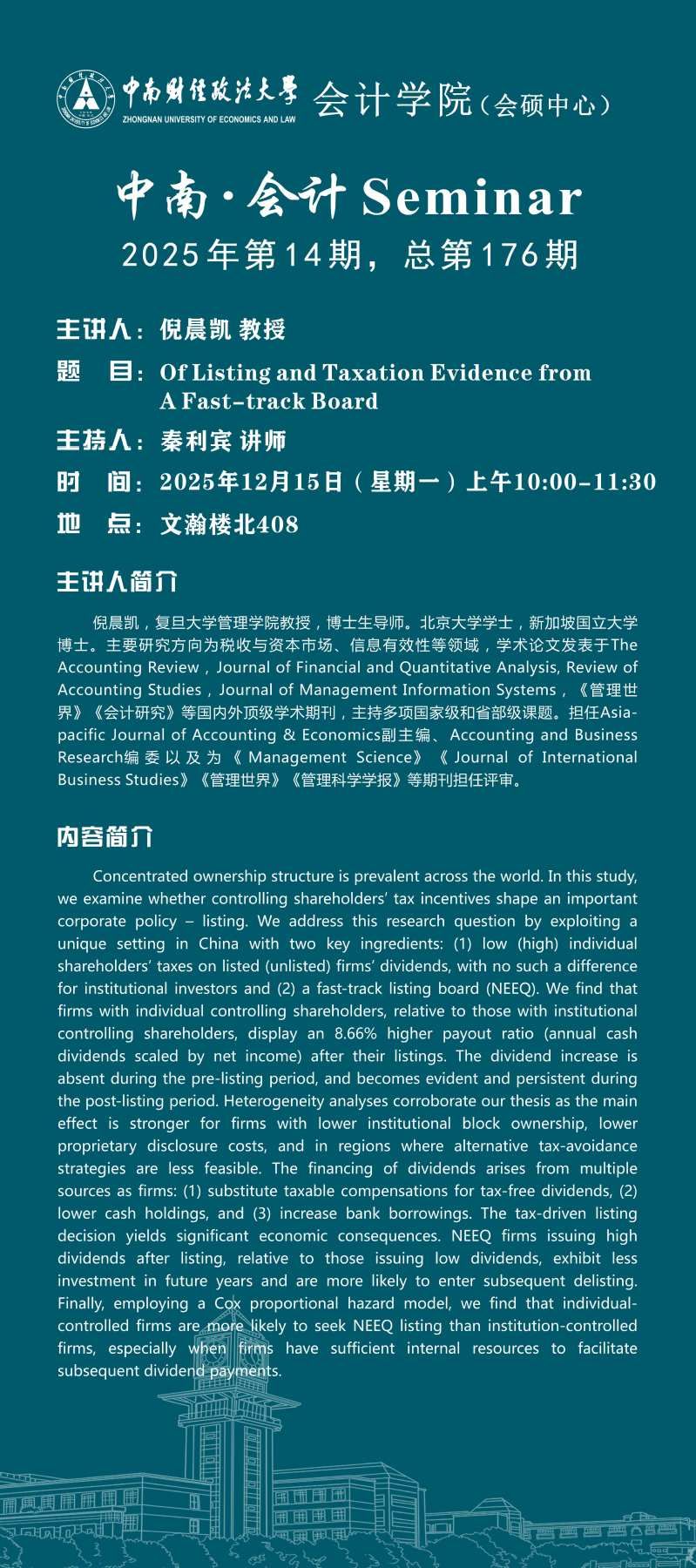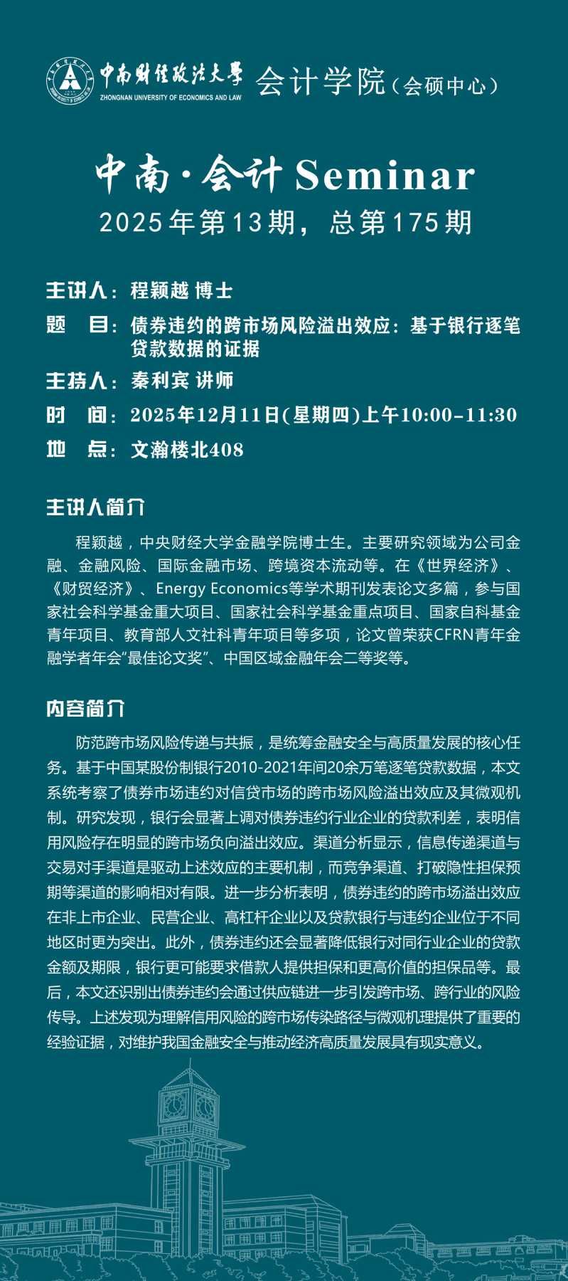 2024年12月7日星期六上午10:00——11:30,会计学院第161次“中南·会计Seminar”学术讲座在文瀚楼北408顺利...