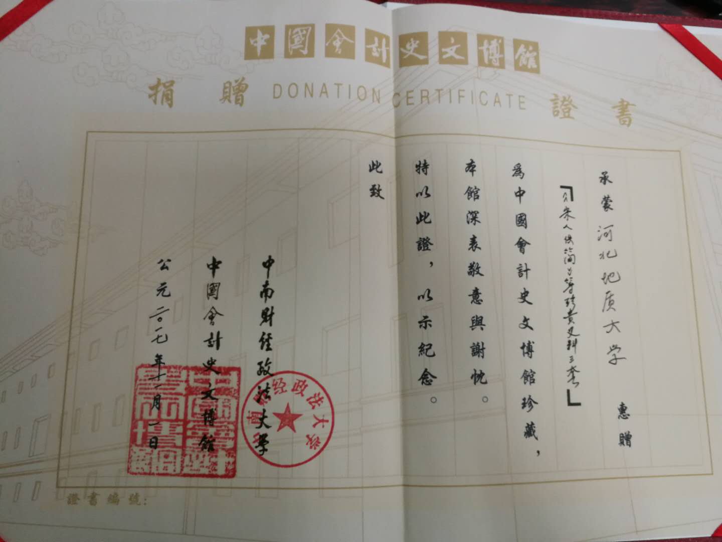 河北地质大学(原石家庄经济学院)创办于1953年,是原地质部直属五大院校之一,是国土资源部、河北省人民政府共建大学,省属重点骨干大学。建校之初,学科专业就以地质类和经济管理类交叉融合而独具特色,享誉国内。河北地质大学会计学院教授杨智杰师从郭道扬教授,是中国会计史文博馆筹备委员会委员,在杨教授的影响下,河北地质大学慷慨捐赠珍贵史料。