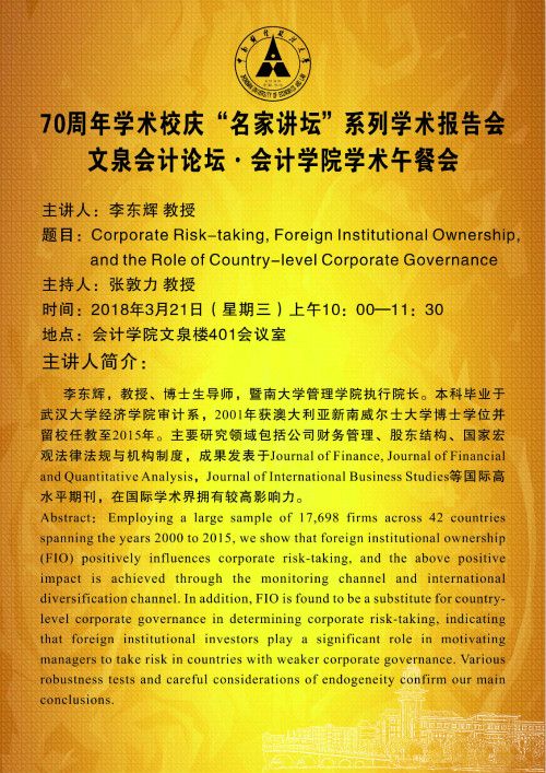 70周年学术校庆“名家讲坛”系列学术报告会-文泉会计论坛•会计学院学术午餐会