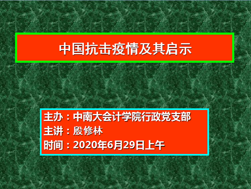在书记上党课环节,党委书记殷修林同志以《中国抗击疫情及其启示》为主题为同志们带来了一场精彩生动的报告。殷修林书记首先介绍了新冠肺炎疫情发展的三个阶段,分析了全球疫情形势,指出疫情的快速蔓延给全球带来了严重影响。面对疫情,中国主要作出了三大重要举措:武汉封城、建立方舱医院、全国隔离,中国展示了伟大斗争的强大力量。最后,殷书记对比全球抗疫提出了几点启示,经过艰苦卓绝的努力,疫情防控阻击战取得了重大战略成果,这个成绩来之不易,是“四个自信”的一次大展示,也是对国家治理体系和治理能力的大考,彰显了中华优秀传统文化品质,面对全球疫情,中国向一百余个国家和国际组织提供了抗疫援助,体现了大国担当,全球抗疫必须树立人类命运共同体意识,携手应对风险挑战,共建美好地球家园。