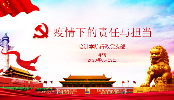 行政党支部副书记陈楠同志以《疫情下的责任与担当》为题主讲了行政党支部“知院爱院,以知促行,做合格党员”特色题活动的第十二讲,主要讲述了疫情下的中华民族、疫情下的大国担当、疫情下的党员责任三个方面的内容。她指出中国共产党带领中国人民用强大组织能力诠释“中国力量”,用抗疫故事诠释“中国精神”,用高效执行力诠释“中国效率”,众志成城展现大国形象。而在国际协助中,中国用积极有效的行动为全球战“疫”雪中送炭,发出的“中国声音”令世界动容,让世界看见“中国担当”。她指出作为教师党员应把战“疫”当作人生的大课,坚守疫情防控人民战争的“防疫阵地”,坚守始终听党话跟党走的“思想阵地”,坚守纪律规矩不可逾越的“安全阵地”,进一步提升思想,守初心、担使命、尽责任。