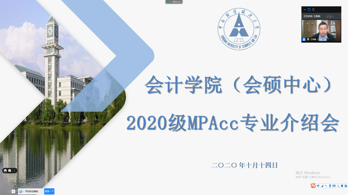2020年10月14日中午12:45,会计学院(会硕中心)2020级非全日制MPAcc专业介绍会于腾讯会议线上举行。会计学院(会硕中心)副院长王昌锐教授、MPAcc导师组组长宋丽梦副教授、季华副教授、研究生工作办公室老师及2020级非全日制MPAcc全体研究生等参加此会议。会议由会计学院(会硕中心)副院长王昌锐教授主持。