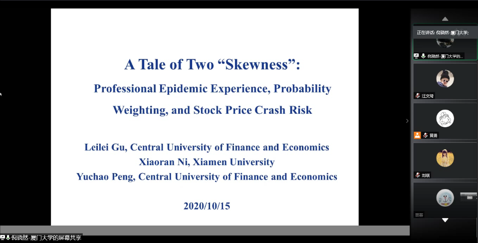 2020年10月15日,“中南·会计Seminar”第82期在腾讯会议线上成功举行。厦门大学倪骁然助理教授应邀为我院师生作了题为《A Tale of Two “Skewness”: Professional Epidemic Experience, Probability Weighting,and Stock Price Crash Risk》的学术报告。