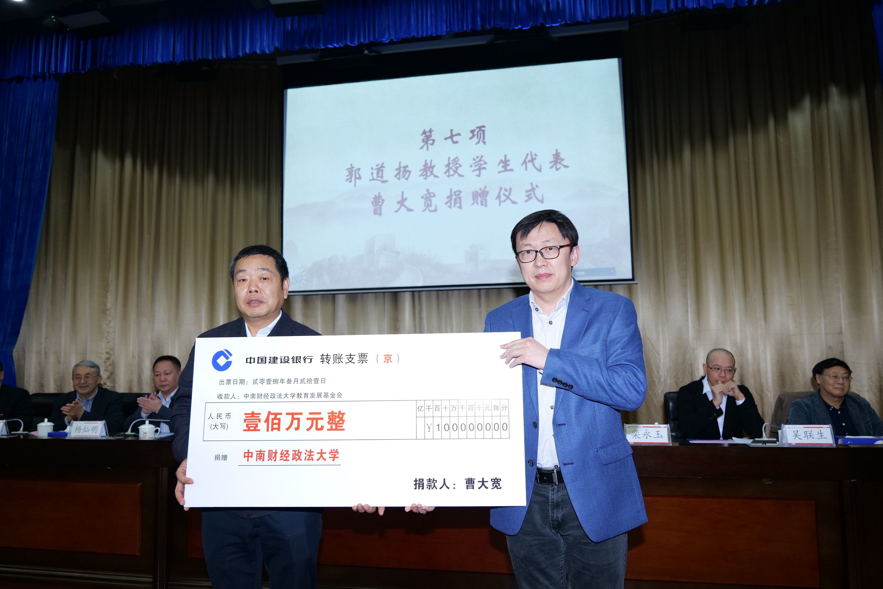不仅郭道扬教授本人关心学校学科发展,他的学生、广大校友和社会各界人士也心系学校。其中我校杰出校友、郭道扬教授的学生代表曹大宽先生向我校捐款100万元用于会计史文博馆建设。我校会计学院冉明东教授代其参加捐赠仪式,校党委书记栾永玉教授颁发捐赠证书。