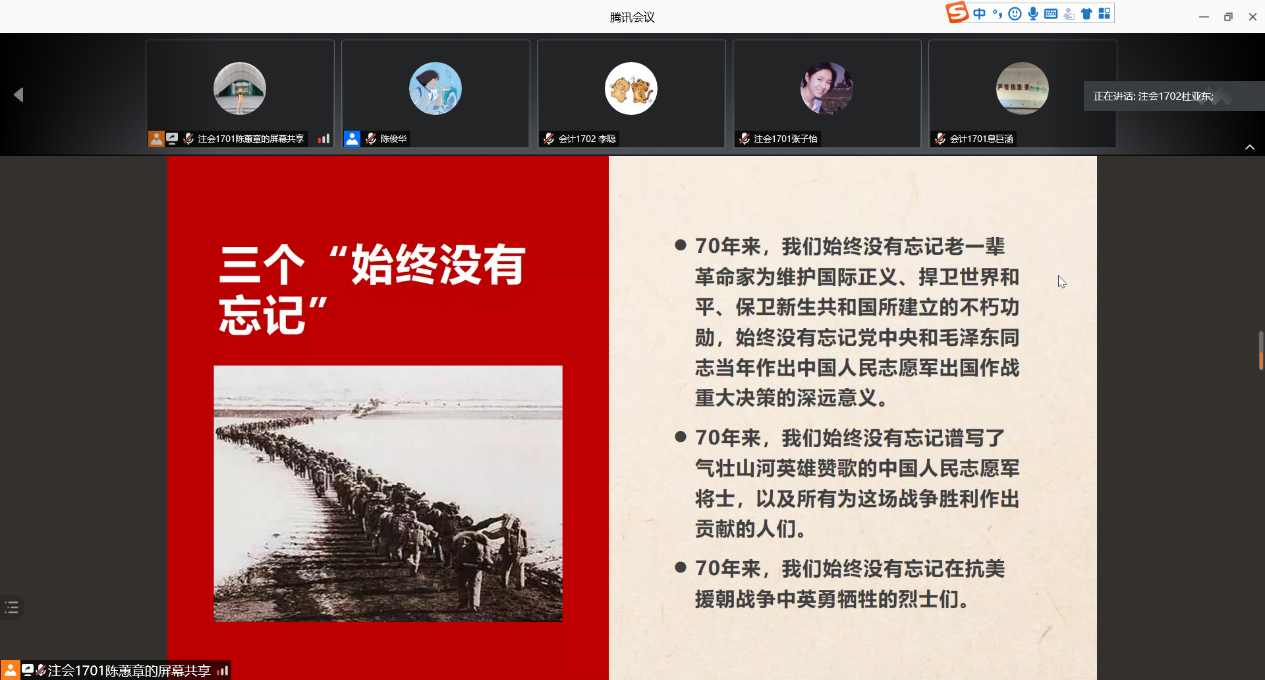 杜亚东同志带领支部成员共同学习《习近平:在纪念中国人民志愿军抗美援朝出国作战70周年大会上的讲话》,回顾了抗美援朝战争胜利的艰辛历程和历史意义,号召大家要弘扬伟大的爱国主义精神和革命英雄主义精神;周备同志与大家共同学习了《中国共产党第十九届中央委员会第五次全体会议公报》,对决胜全面建成小康社会所取得的决定性成就进行了逐一的介绍,使支部成员充分了解中央政治局在今后的工作重心;刘望、韩舒婷与金一虹同志共同领学《中共中央关于制定国民经济和社会发展第十四个五年规划和二〇三五年远景目标的建议》,通过介绍“十四五”时期经济社会发展指导方针和主要目标,使大家充分认识当前国际与国内的经济发展形势;刘琦同志带领大家系统学习了《关于巩固深化“不忘初心、牢记使命”主题教育成果的意见》,详细介绍了巩固深化“不忘初心、牢记使命”主题教育成果的九条意见,呼吁大家要心怀敢担当、善作为的党员素养与奉献精神。