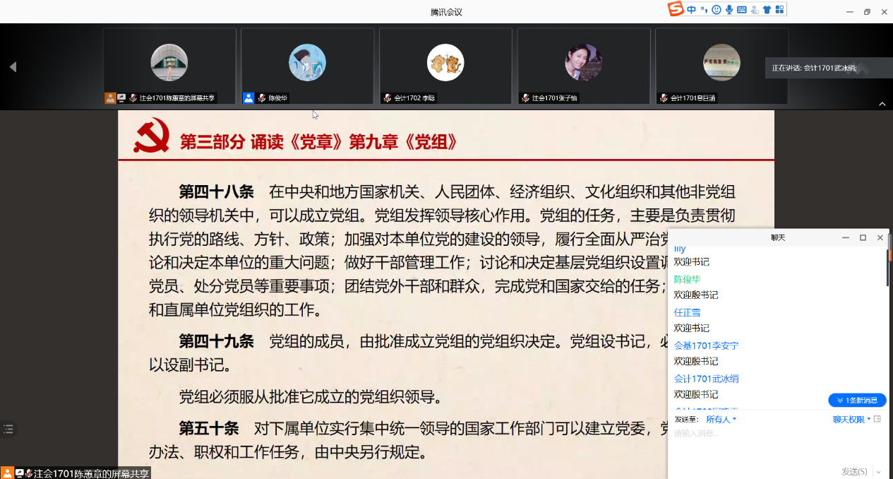 2020年11月17日,会计学院本科2017级学生党支部在线上开展11月份支部主题党日活动。本次支部活动有幸邀请到院党委书记殷修林教授指导工作,支部书记陈俊华同志、副书记范纯琍同志以及支部全体学生党员参加了本次学习。活动由陈蕙章同志主持,全体成员会前重温入党誓词、合唱米兰电竞·(中国区)校歌,在武冰绡同志诵读《中国共产党章程》第九章《党组》后,支部开始了理论学习。