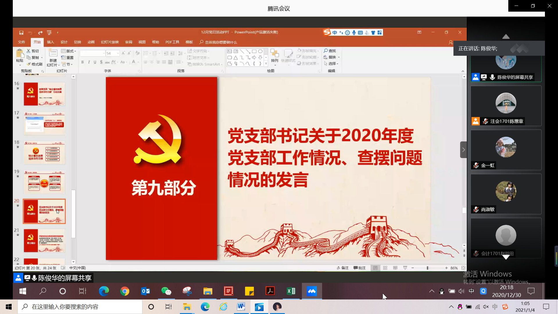 随后,陈老师对支部2020年度的工作进行了全面总结,对支部成员取得的各项成就表示祝贺,每一位党员同志都能立足自身岗位,为支部发展和服务年级同学作出自己力所能及的贡献,充分发挥了党员的先锋模范作用,同时号召大家继续推进班级、年级的就业工作。陈老师也对目前支部存在的不足之处进行反思,如支部的学习形式不够丰富,主题实践活动方面也比较欠缺,有望进一步调整与改善。