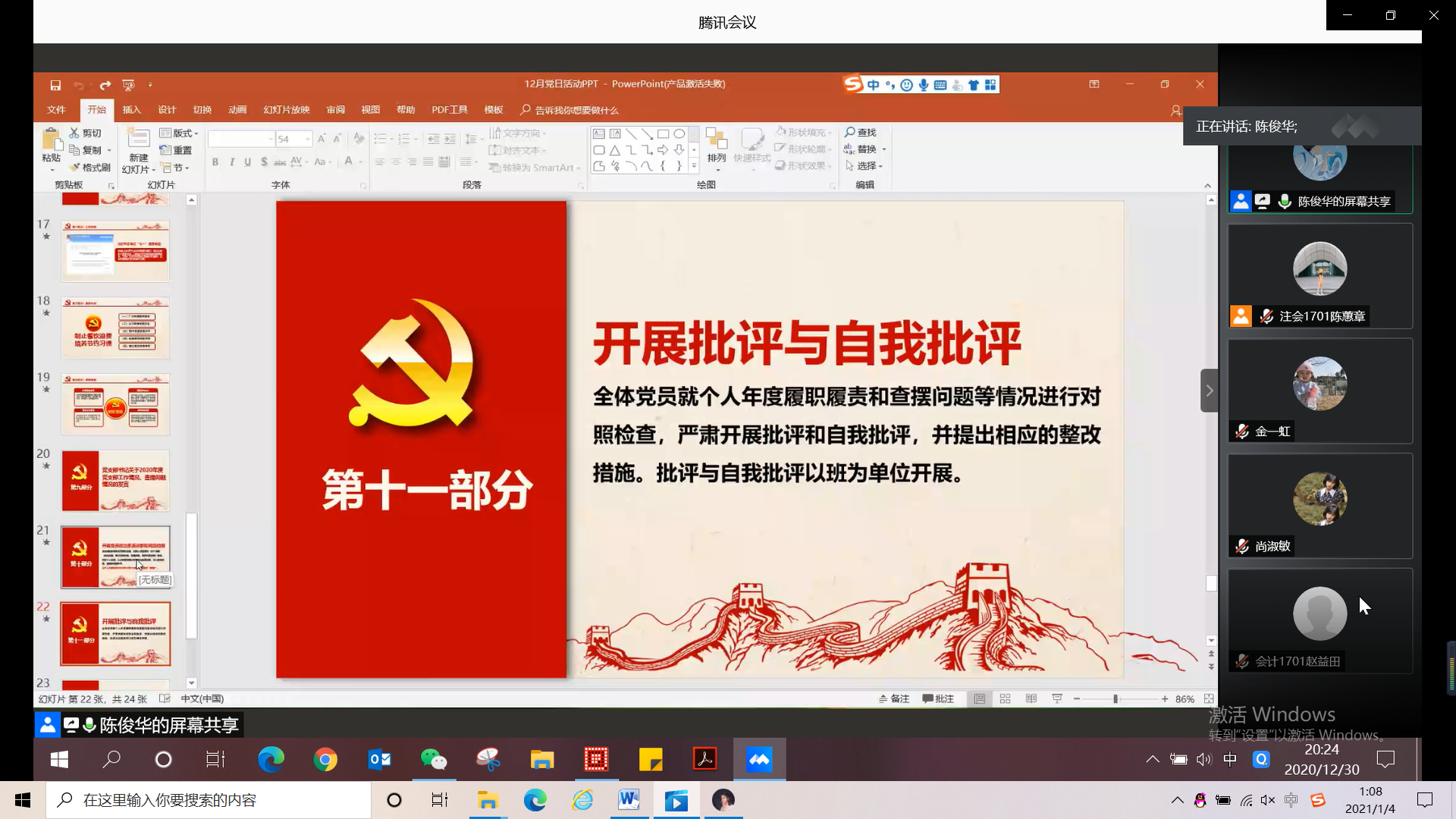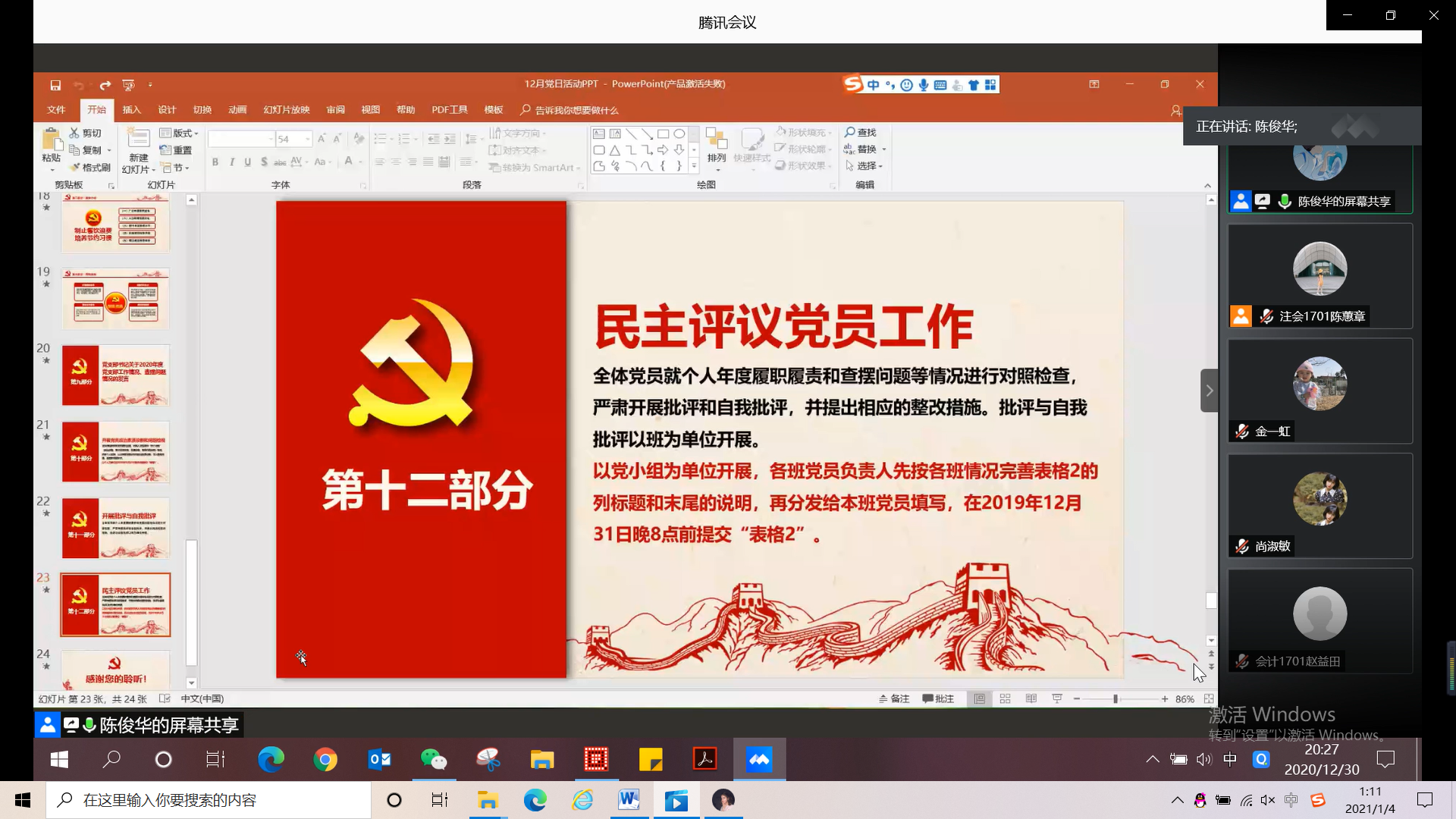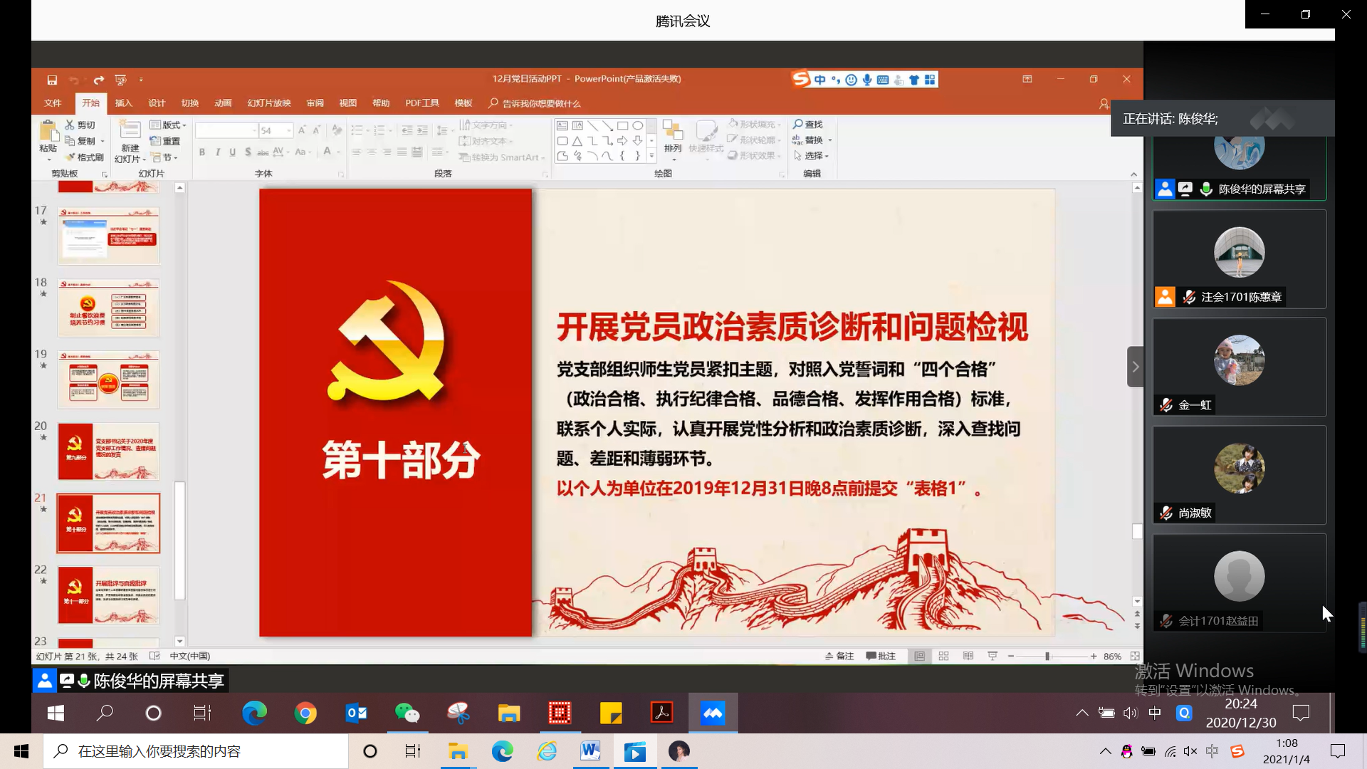2020年12月30日,会计学院本科2017级学生党支部在线上开展十二月份支部主题党日活动。活动由支部书记陈俊华老师主持,本科17级支部的105位党员同志们全部参加了本次学习。全体成员会前重温入党誓词、合唱米兰电竞·(中国区)校歌,在赵希同志诵读《中国共产党章程》第十章《党和共产主义青年团的关系》后即展开了腾讯会议的线上学习。