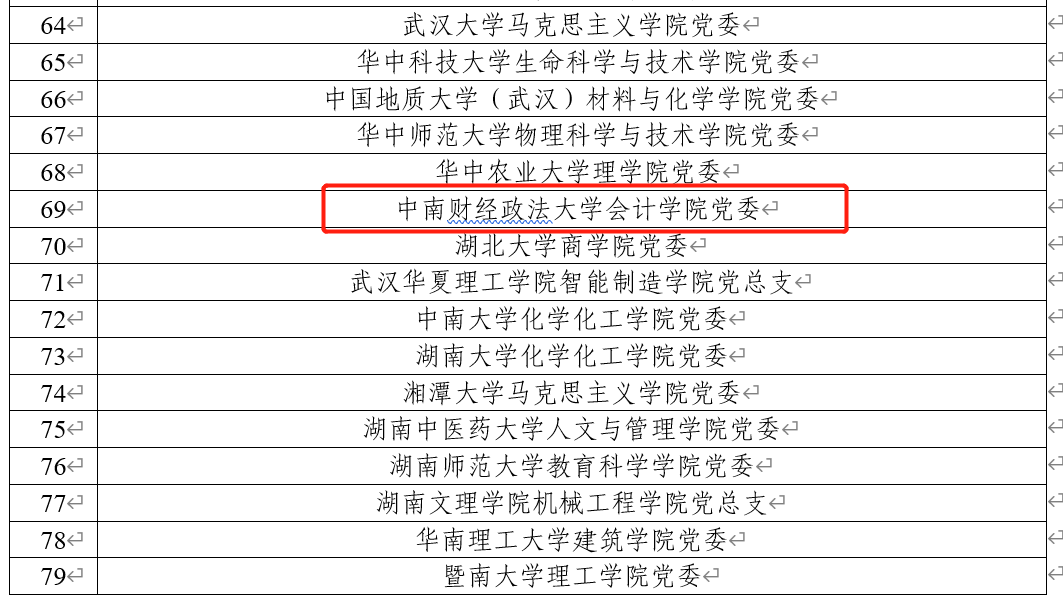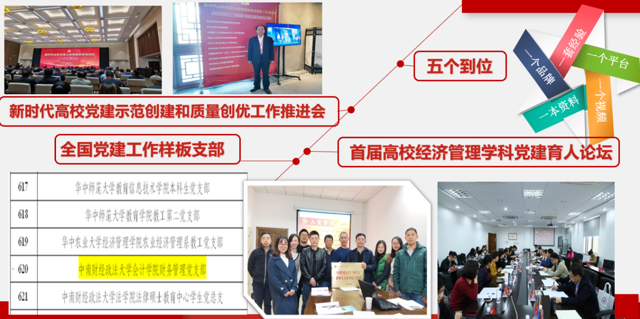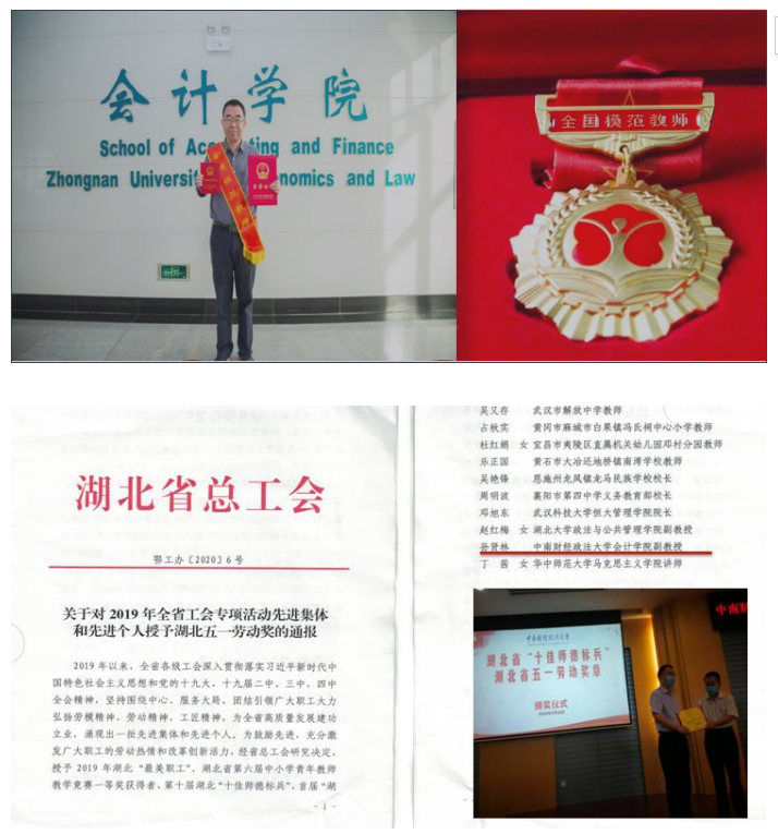 学院获湖北省高等学校“先进基层党组织”;连续三年党建工作、学科建设、本科教学、科学研究、研究生培养、职工管理与师资队伍建设、学生工作、就业创业、行政管理等9 项工作获得学校二级单位年终考核“全优”;入选校级“三全育人”综合改革单位;财务管理党支部入选教育部第二批全国党建工作样板支部;财务管理党支部入选首批校级“双带头人”教师党支部书记工作室建设名单;研究生学习宣传贯彻习近平新时代中国特色社会主义思想工作案例荣获湖北省优秀奖;学硕2018级财管审计党支部获学校2019年研究生样板党支部培育项目一等奖;审硕1902党支部获学校2020年研究生样板党支部培育项目二等奖;院长张敦力教授入选2019年“会计名家培养工程”;孙贤林教授荣获“全国模范教师”、湖北省“十佳师德标兵”、湖北省“五一”劳动奖章;审计硕士黄俊德、博士蒋安璇分别荣获校“不忘初心跟党走•青春筑梦新时代”党建主题演讲比赛三等奖、优秀奖……
