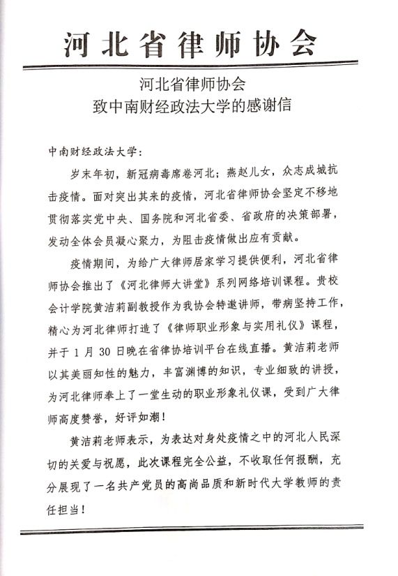 (通讯员 畅雅莉 李瑞玲)近日,学校收到河北省律师协会发来的感谢信,赞扬会计学院黄洁莉副教授公益授课,支持河北省律师协会会员居家学习的先进事迹。