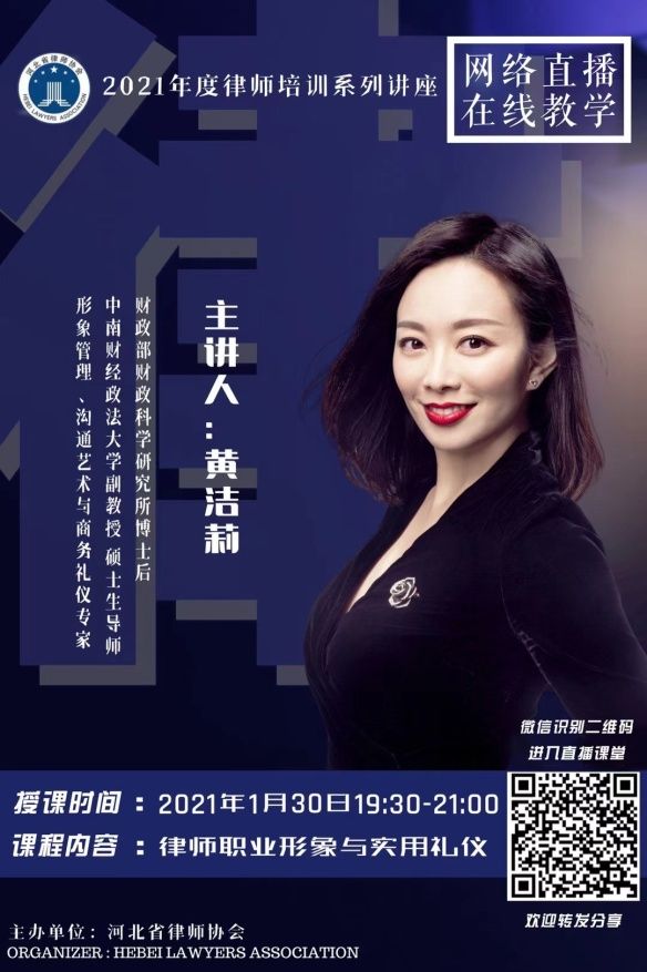 岁末年初,新冠肺炎疫情席卷河北,为给广大律师居家学习提供便利,院纪委委员、财务管理系副主任、全国党建工作“样板党支部”财务管理党支部纪律委员黄洁莉副教授作为《河北律师大讲堂》特邀讲师,带病坚持工作,精心为河北律师打造了《律师职业形象与实用礼仪》课程,并于1月30日晚在河北省律协培训平台在线直播。黄洁莉老师以其美丽知性的魅力,丰富渊博的知识,专业细致的讲授,为河北律师奉上了一堂生动的职业形象礼仪课,受到广大律师高度赞誉,好评如潮。