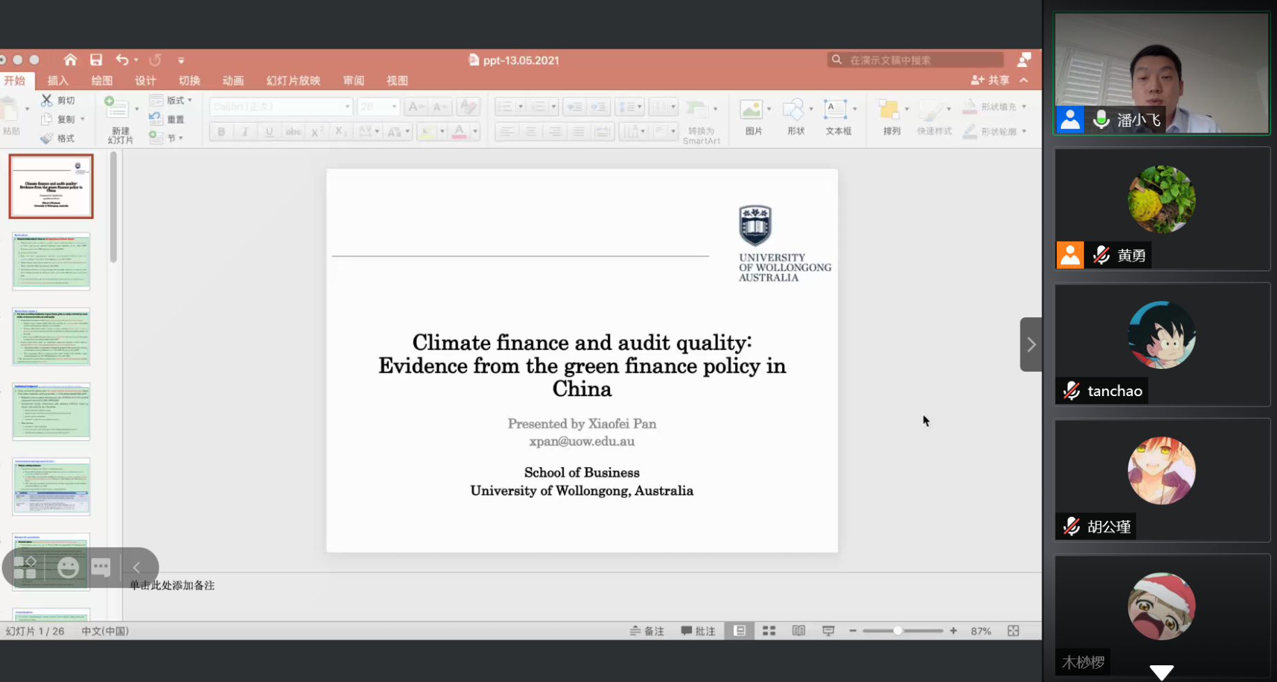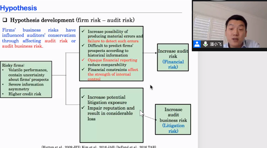 2021年5月13日,“中南·会计Seminar”第96期在线上成功举行。澳大利亚University of Wollong高级讲师潘小飞博士应邀为我院师生作了题为《Climate finance and audit quality: Evidence from the green finance policy in China》的学术报告。