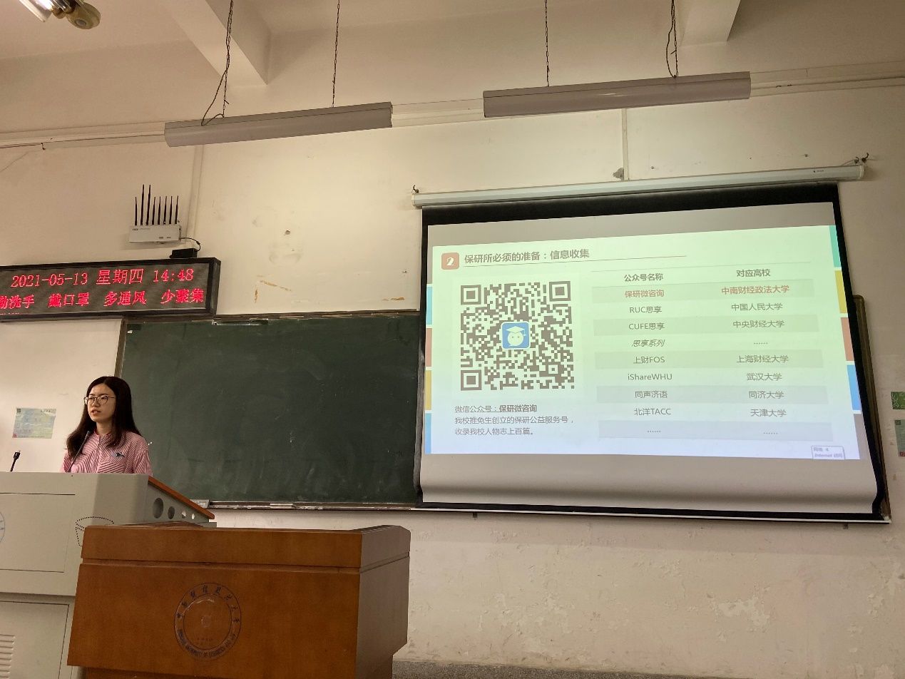 在第一个保研板块,分享的是保送到清华大学管理学院的陈蕙章师姐。她对保研流程和时间线进行了全方位解析,并从基础准备、信息收集、努力方向三个方面分享了二年级学生可以为保研所做的准备,还具体指导同学们如何从论文、实习、比赛几方面提升个人综合能力,在谈到保研体会时,她勉励同学们既要学会研判保研形势,也要学会克服焦虑,更要坦然接受结果,做到“全力以赴,也要满不在乎”。