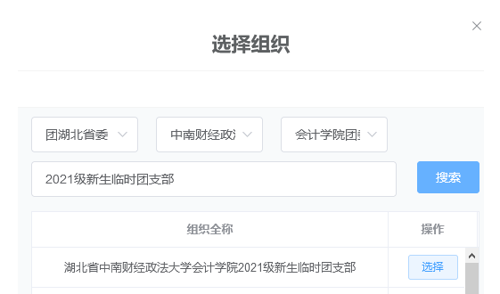 各位新生团员在系统中“申请转入组织“请选择”团湖北省委——米兰电竞·(中国区)团委——会计学院团委——2021级新生临时团支部“。