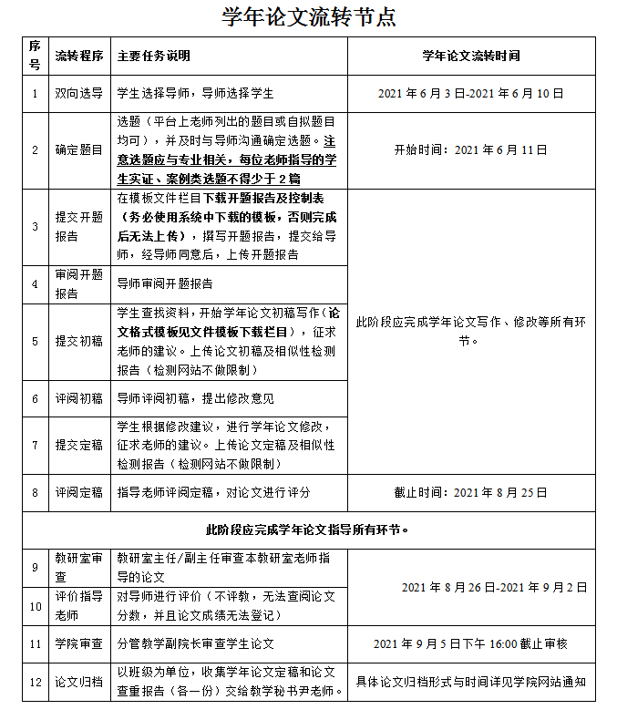 学院已在论文系统中设置各阶段的时间节点(如下表),请指导教师和学生严格遵照相关的时间要求,如学生提交论文资料逾期一次,学年论文成绩建议指导老师扣减5分。