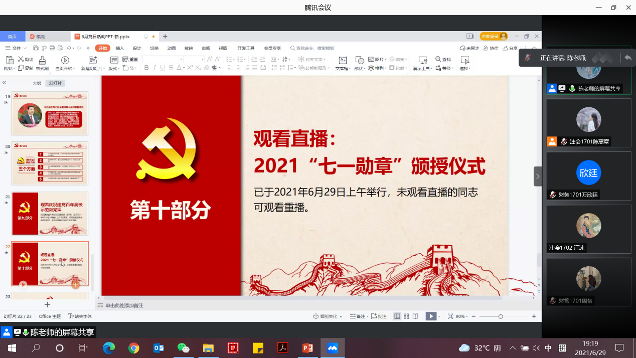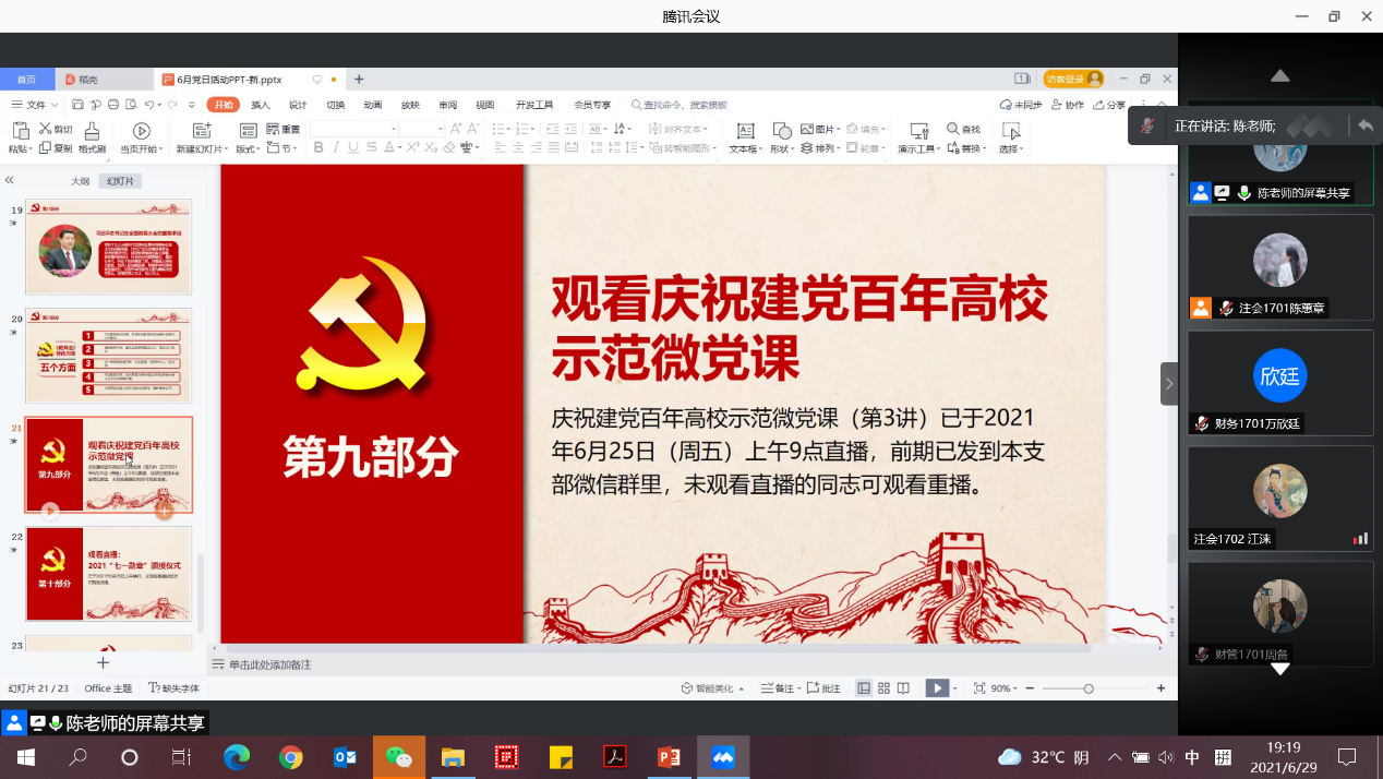 此外,全体支部成员共同观看了庆祝建党百年高校示范微党课及2021“七一勋章”颁授仪式直播回放,进一步强化了支部成员的党性修养。