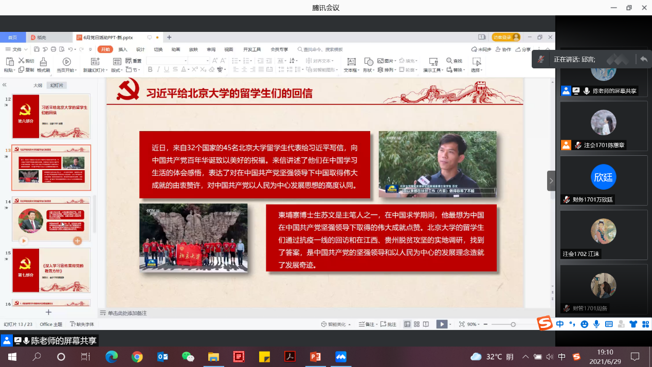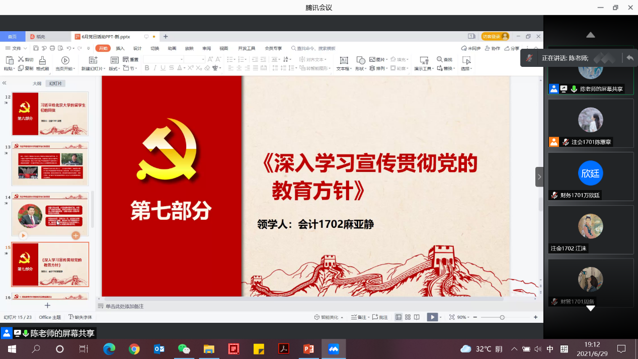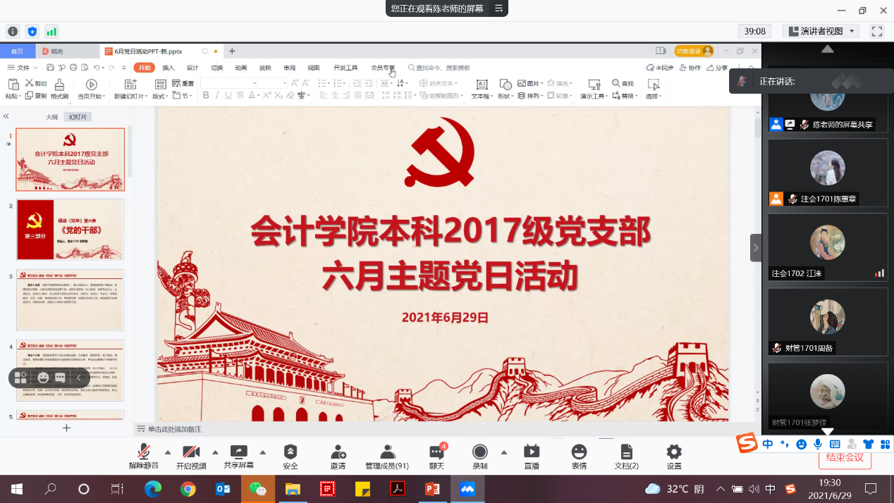 2021年6月,会计学院本科2017级学生党支部采取线上线下相结合的方式,在毕业生党员离校前,顺利开展了“奋斗青春心向党,礼赞百年庆华诞”系列主题教育活动。