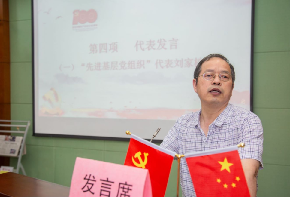 “先进基层党组织”代表原理、研究所党支部书记刘家松回顾了原理研究所党支部科研代表郭道扬教授、教学代表孙贤林教授、科研与教学双重代表唐国平教授的先进事迹。刘家松表示,支部的未来任重道远,希望党的初心在支部薪火相传、代代不息。