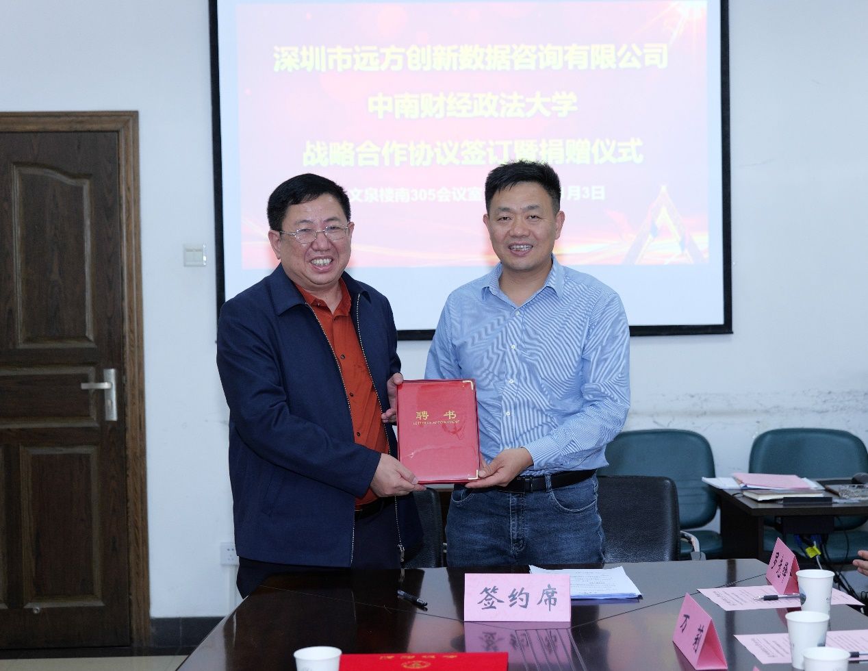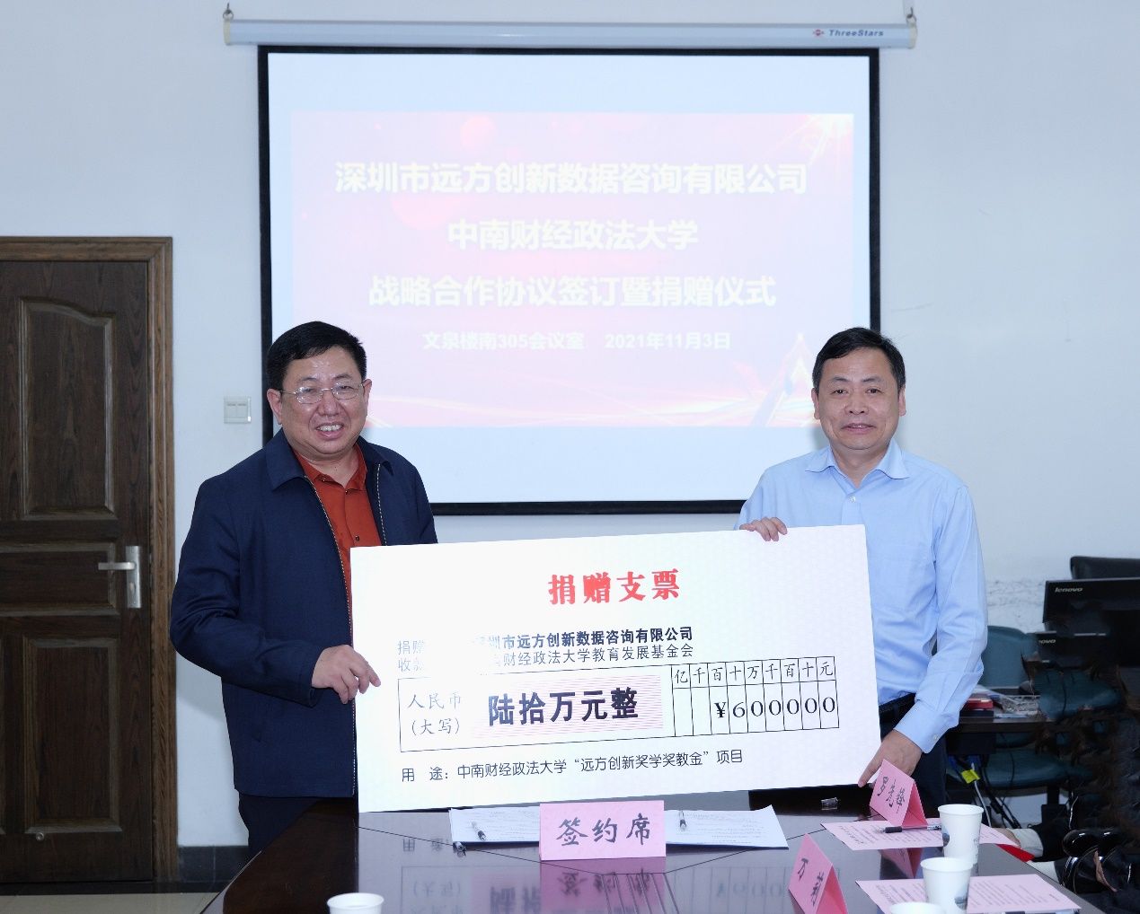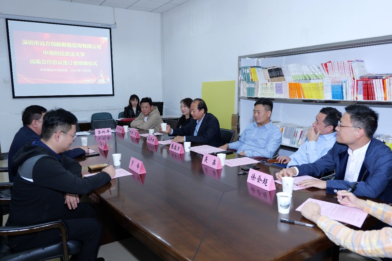 (通讯员 杜婉秋)2021年11月3日,学校与深圳市远方创新数据咨询有限公司(以下简称“远方创新公司”)战略合作协议签订暨捐赠仪式在文泉楼南305室举行。远方创新公司董事长阮国平、董事长助理罗峰莅临我校,校友工作与社会合作部部长、教育发展基金会秘书长聂鑫,校友工作与社会合作部副部长、教育发展基金会副秘书长万莉,会计学院院长张敦力,会计学院党委书记殷修林,会计学院党委副书记兼行政副院长、纪委书记徐会超,会计学院组织员罗先锋,校友工作与社会合作部办公室主任杨少同等出席了仪式。仪式由徐会超主持。
