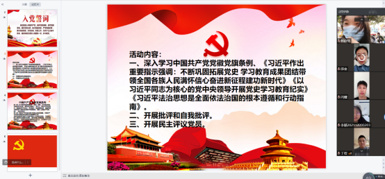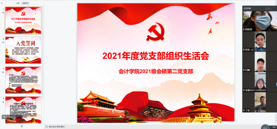 2021年12月30日,会计学院2021级会硕第二党支部于线上开展了12月主题党日、2021年度党支部组织生活会和民主评议党员工作,会硕第二党支部全体党员同志参加了此次活动。
