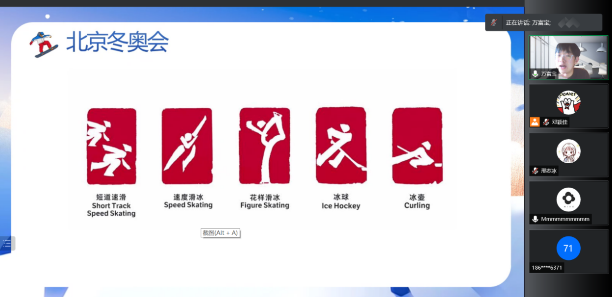 课程开始,邢志冰同志与同学们一起追溯冬奥会的起源。在人类不断追逐自由和超越运动极限的过程中,冬季奥运会诞生,它的诞生为全世界有着相同爱好和梦想的人提供了一座展现风采的冰雪舞台。接着,邢志冰用一段充满欢呼喜悦的北京申冬奥成功的视频点燃了同学们的兴趣,让同学们感受到北京成为世界上首座“双奥之城”的非凡意义。而后,邢志冰向同学们重点介绍了2022年北京冬奥会的基本情况,“冬梦”“飞跃”会徽含义讲解、赛区赛道的图片展示,开幕式中国元素精剪视频……多样丰富的素材让同学们学得津津有味。尤其在介绍冬奥会吉祥物冰墩墩和雪容融时,同学们激动地喊出他们的名字,并与身边的朋友分享自己的感想。邢志冰通过吉祥物名字拆分方法,讲解了冰墩墩象征着纯洁、敦厚、健康,以及雪容融具有洁白、包容、融合的内涵,同学们也知晓了更多“藏在吉祥物身上的秘密”。在最后的知识小测环节,同学们竞相抢答,展示自己所学,课堂气氛十分活跃。