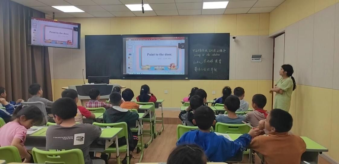 课堂中,同学们大声跟读单词,能够积极地参与老师组织的小游戏,在课堂将要结束时能够流利地表达指向门、桌子、椅子、黑板等语句,课堂呈现了较好的效果。