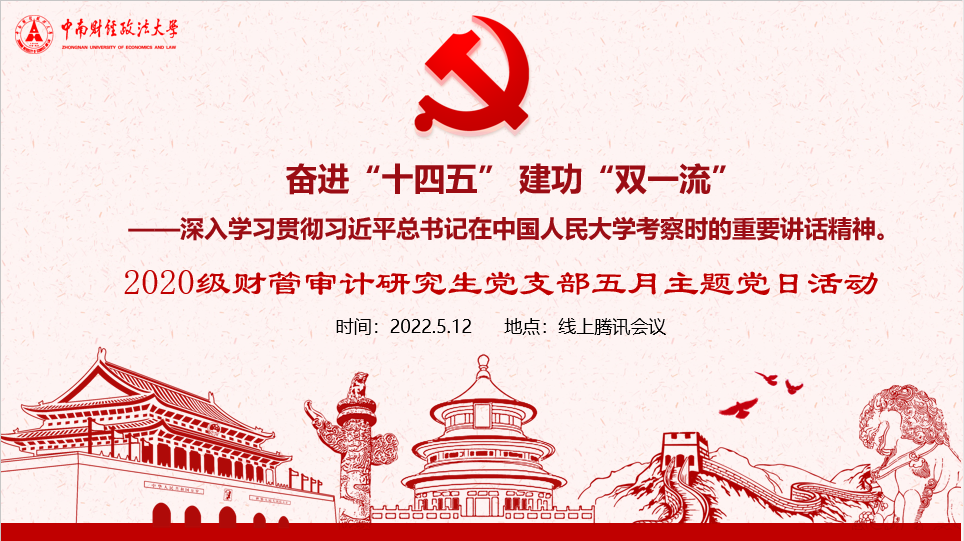 (通讯员 赵漪)2022年5月12日,学硕2020级财管审计研究生党支部在线上以“奋进十四五,建功双一流”为主题开展党日活动,整场活动由党支部书记武丽娟同志主持。