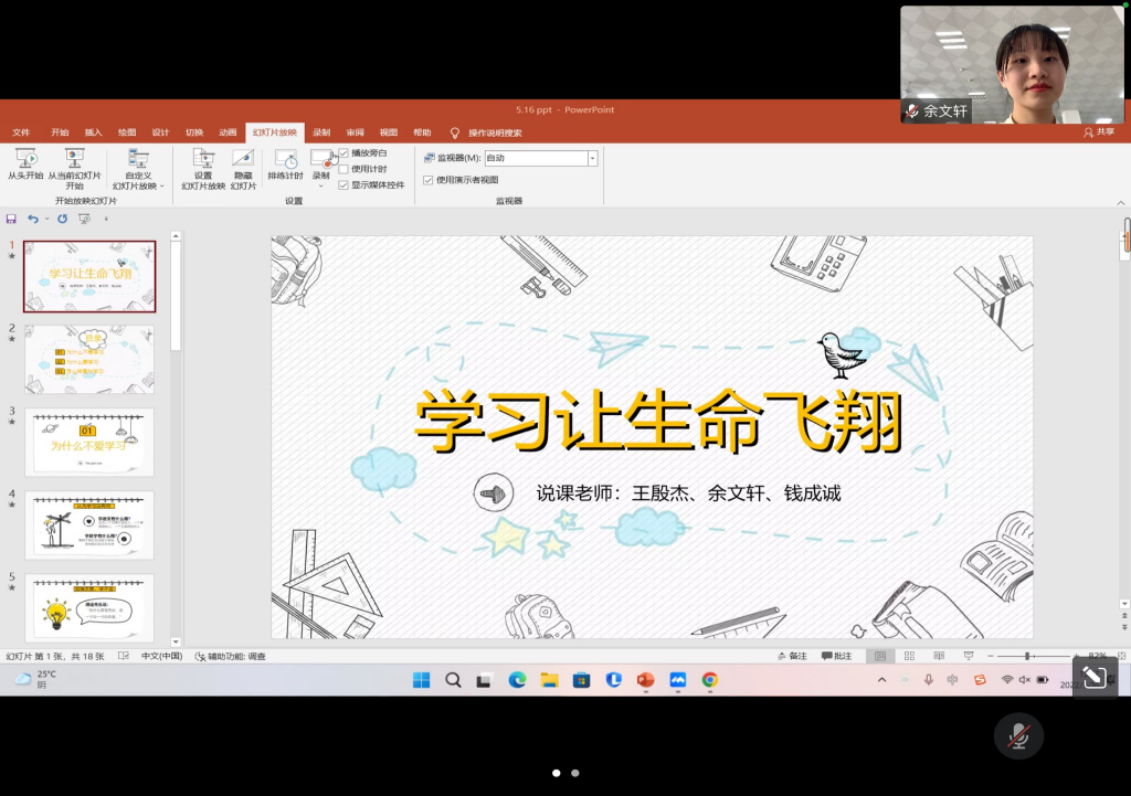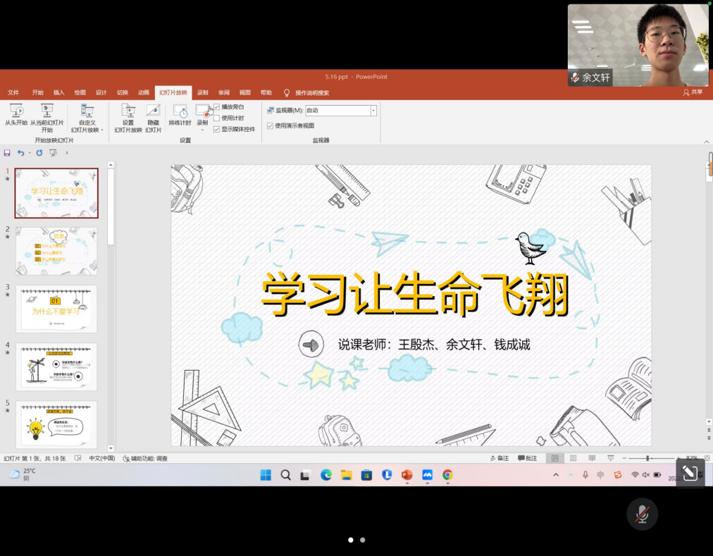 (通讯员 王殷杰)2022年5月16日下午,会计学院学生党员志愿服务团成员为云南省盐津县箭坝小学五年级师生开展名为“学习,让生命飞翔”的“云课堂”教学活动,教学内容为学习积极性提升,旨在帮助学生激发学习积极性,培养良好的学习习惯。此次课程由学生党员王殷杰和余文轩主讲,箭坝小学五年级班主任时兴林老师及五年级全体学生参加了本次活动。