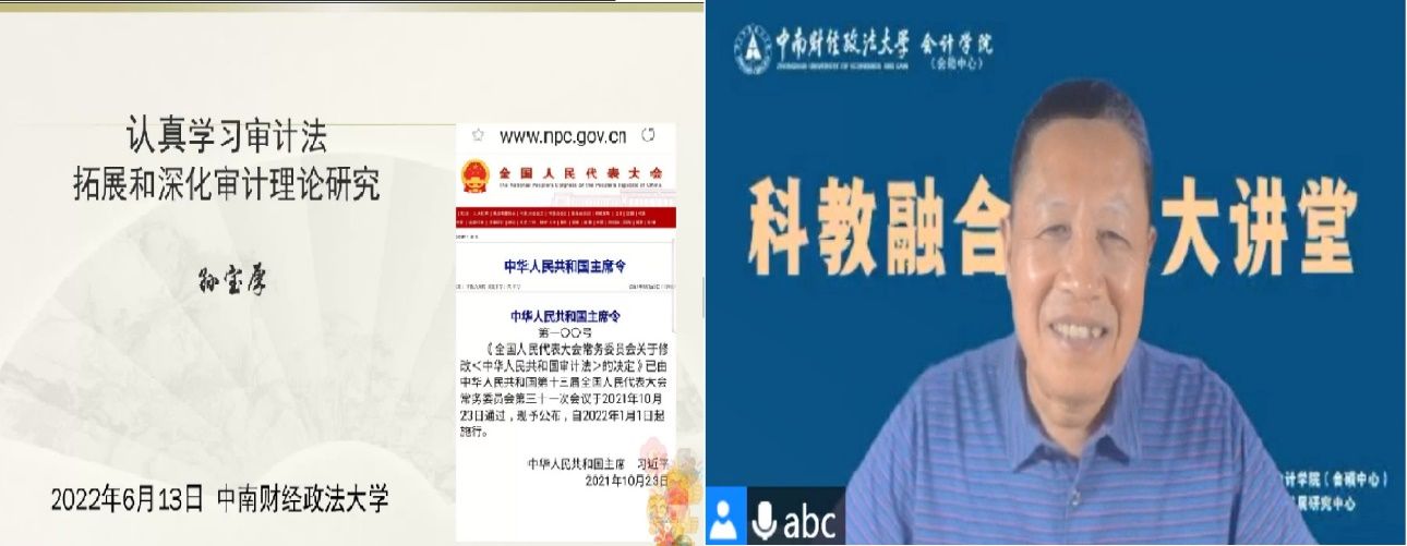 为打造卓越的研究生教育,营造良好学术研究氛围,通过科教融合育人机制孵化出一批扎根中国社会、志向高远、成果突出、具有引领示范作用的研究生,2022年6月13日晚上19:00会计学院第2期“科教融合育人大讲堂”在云端隆重开讲。中国审计学会会长、审计署原副审计长、党组成员,孙宝厚博士作为主讲嘉宾,以“认真学习审计法,拓展和深化审计理论研究”为题,面向会计学院师生作了一场高水平的学术讲座。本场讲座由中国会计学会副会长、湖北省米兰电竞·(中国区)注册会计师行业发展中心主任张龙平教授主持,近300名硕博研究生及青年教师参加了本次讲座。