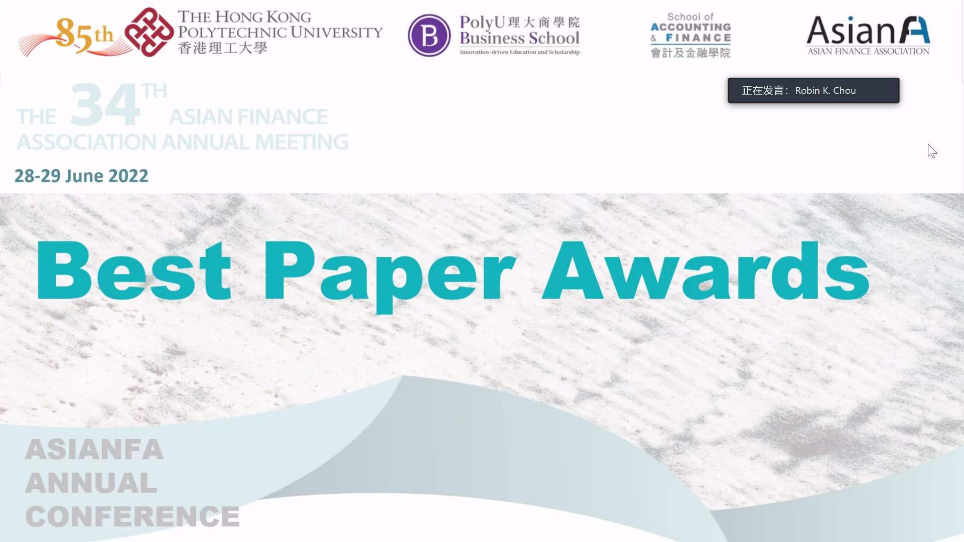 2022 Asian Finance Association (AsianFA) Annual Conference由亚洲金融学会和香港理工大学联合举办。据会议组织者统计,本次会议一共收到投稿论文657篇,入选会议报告297篇,其中3篇获得AsianFA Best Paper, 4篇获得PBFJ Best Paper Award, 2篇获得AMTD FinTech Center Best FinTech Paper Award, 2篇获得Ph.D. Best Paper Award。