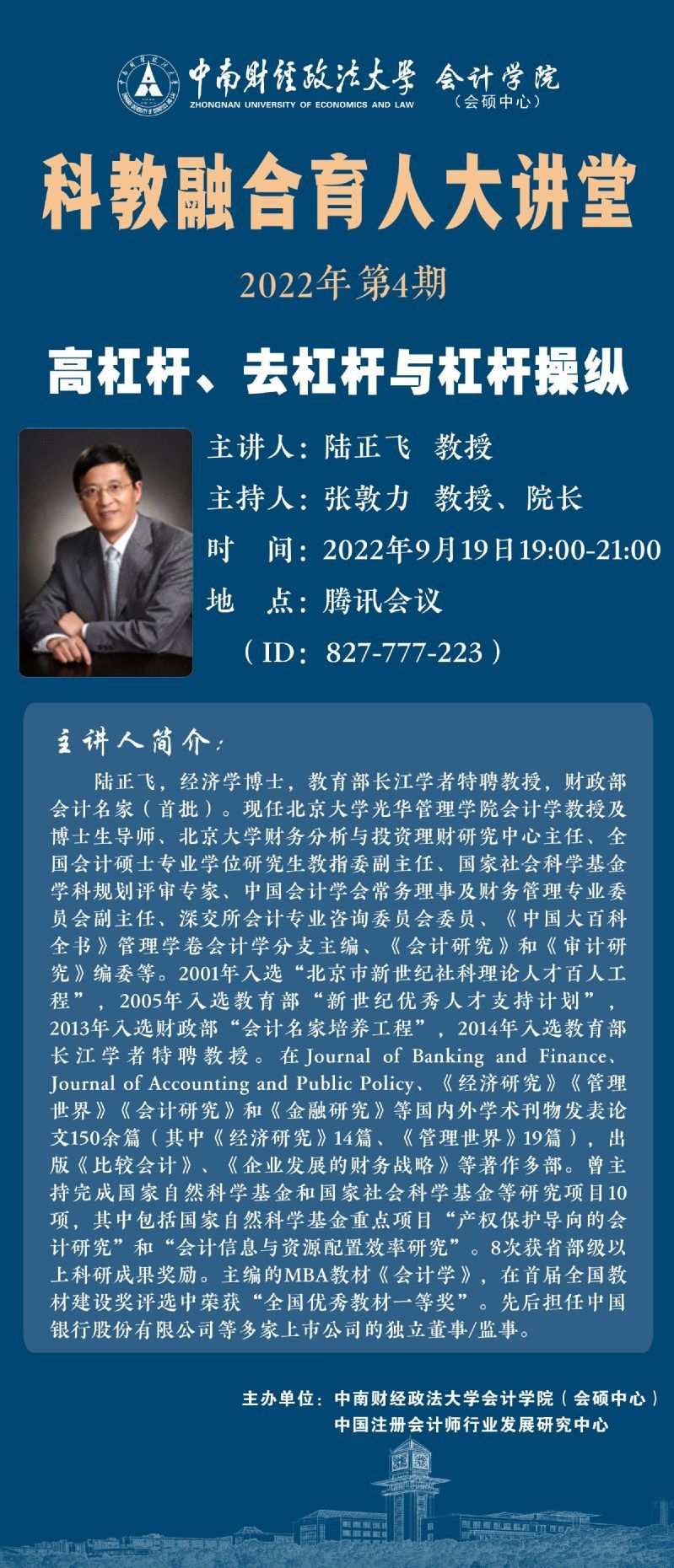 本次我们诚挚邀请北京大学光华管理学院陆正飞教授作为主讲嘉宾,为我们带来第4期科教融合育人大讲堂。