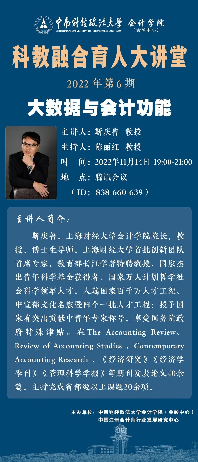 本次我们诚挚邀请上海财经大学会计学院院长靳庆鲁教授作为主讲嘉宾,为我们带来第6期科教融合育人大讲堂。