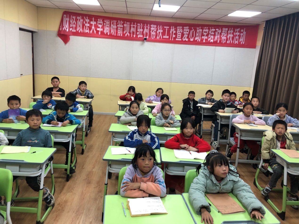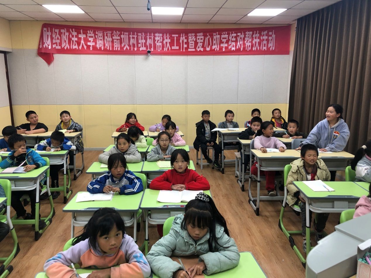 接下来,彭碧婷同志提升了课堂的难度,依次讲述了七个成语,用生动的语言讲述每个成语故事,讲完后引导同学们对成语的寓意进行思考,并请同学们造句,联想以往学过的相关近义词或反义词,加强大家对成语的运用能力。同学们在互动环节都表现出了很高的热情,积极举手回答问题,在每个成语讲解完后还做了笔记。在讲到“杞人忧天”这一成语时,一个女生站起来造句说,“很多同学担心自己读不了初中,这完全是杞人忧天。”借此,彭碧婷同志告诉同学们大家都可以接受九年义务教育,不必为此担心,只要大家认真学习,还可以读大学,看更广阔的世界,鼓励孩子们积极向上,努力学习。