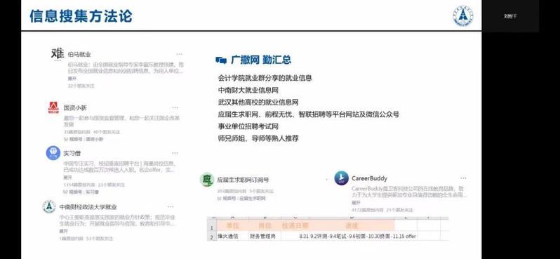 刘煜千从自我定位、信息搜集和求职经验三个部分分享了自己在秋招中成功的秘诀。他认为,在开始求职之前要明确自身能力,找到优势和劣势,再去扬长避短。在搜集信息方面,他提供了一些和国企事业单位等相关的招聘信息获取渠道给大家参考。