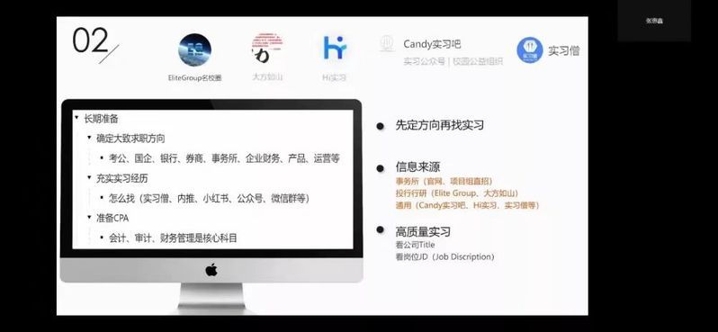 张惠鑫介绍了自己的实习经历,并分享了高效寻找实习工作的方法,列举了一些具体的实习信息获取渠道;同时提醒大家,求职需要一些长期的准备,比如要先确定实习的方向,再去有的放矢地寻找信息,也需要进行短期准备,比如明确具体的方向、打磨简历、复习专业知识、及时网申、准备常见的问题、复盘实习过程等。