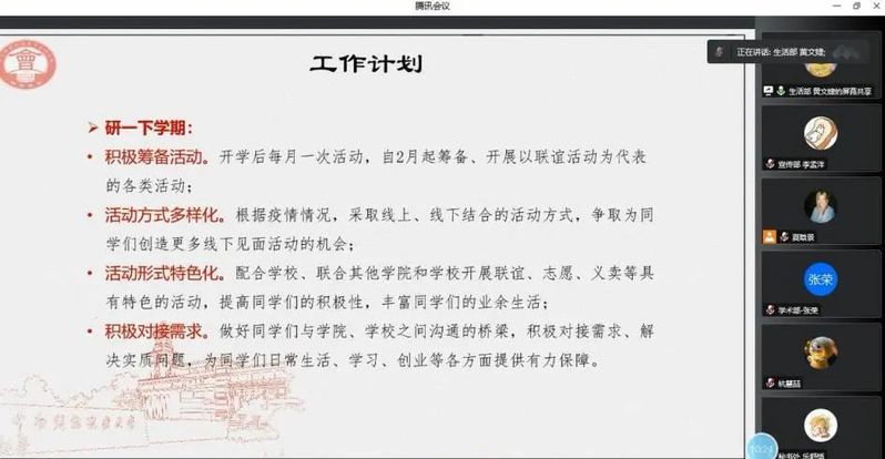 会议伊始,各部门负责人和分管主席分别对第一学期的工作内容进行了梳理,对工作的完成情况与活动反响进行了重点汇报,同时也分享了工作中遇到的困难与挑战,与大家交流了解决方案与心得体会,对下学期的工作进行了规划与畅想,表达了将继续勤恳认真、服务同学的热情与决心。