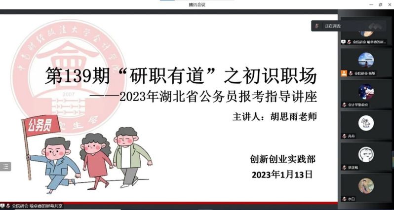 为了响应国家对优秀毕业人才应深入基层,勇担时代责任,为国家的发展做出贡献的号召,我院在省考报名临近之际,于1月13日成功举办第139期“研职有道”之初识职场——2023湖北省公务员报考指导讲座,加深同学们对公务员考试的认识。本次讲座以腾讯会议的形式线上进行,邀请了华图教育胡思雨老师为大家进行分享与指导。