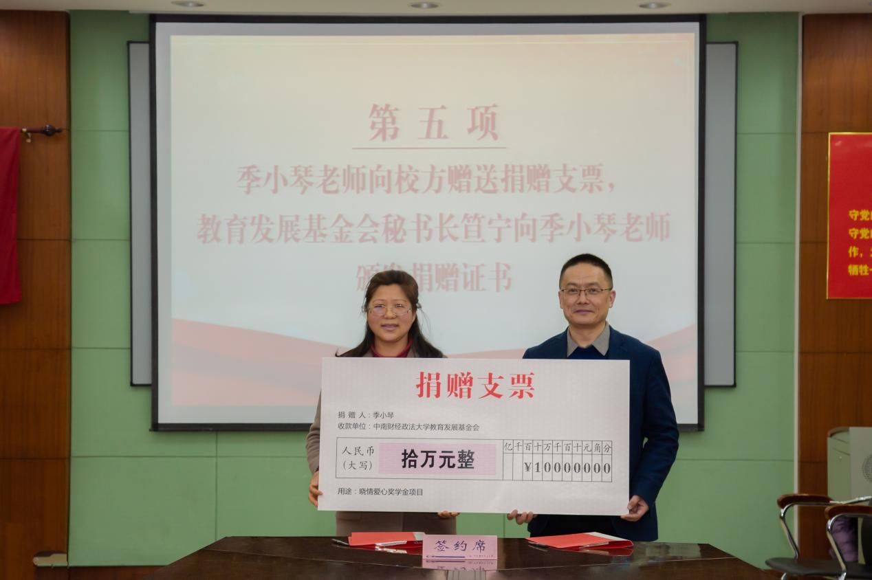 2023年2月16日,由季小琴老师捐资、发起设立的“晓情爱心奖学金”捐赠仪式在会计学院文泉南楼401会议室顺利举行。校教育发展基金会秘书处、会计学院领导班子成员及全院教职工出席捐赠仪式。仪式由会计学院党委书记殷修林教授主持。