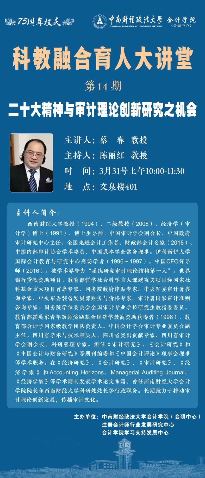本次我们诚挚邀请西南财经大学会计学院蔡春教授作为主讲嘉宾,为我们带来第14期科教融合育人大讲堂。